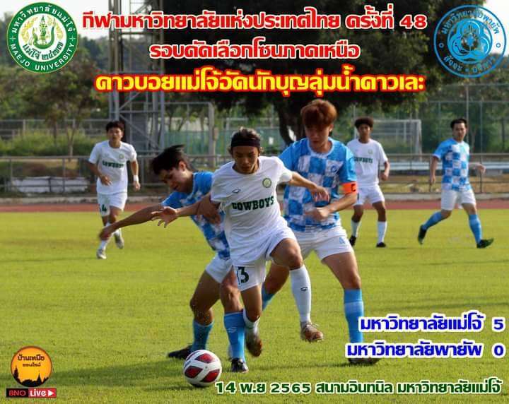 แข้งมหาวิทยาลัยแม่โจ้ประเดิมสนามสุดหรู ในการเเข่งขันฟุตบอลกีฬามหาวิทยาลัยเเห่งประเทศไทย ครั้งที่ 48 รอบคัดเลือก เขตภาคเหนือ (ประเภททีมชาย) ที่สนามอินทนิล มหาวิทยาลัยแม่โจ้ เมื่อช่วงสายของวันนี้ 14 พศจิกายบน 2565 โดยหนุ่มคาวบอยแม่โจ้เป็นฝ่ายบุกถล่มนักบุญลุ่มน้ำคาว ไปแบบขาดลอย 5 ประตูต่อ 0 จากการทำประตูของ ธัชพล มโนชมภู 2 ประตู อัจฉริยเดช ดอกมาลา ,พงศ์พันธ์ คำเขียว ชุติพงศ์ สรรเสริญ คนละหนึ่งประตู ส่วนผลการแข่งขันอีกสองคู่มีผลดังนี้