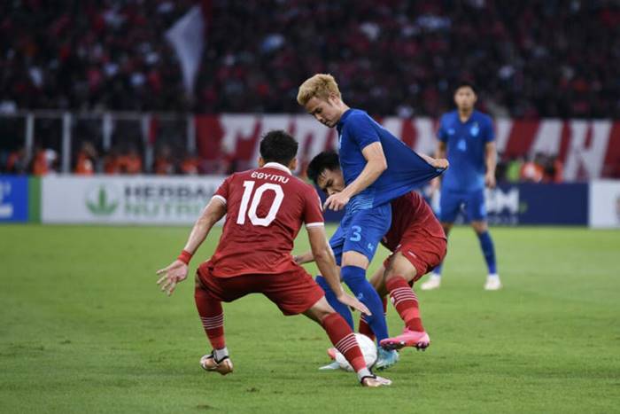 “ช้างศึก” ทีมฟุตบอลทีมชาติไทย ที่เหลือ 10 คน ไล่ตามตีเสมอ “การูด้า” อินโดนีเซีย 1-1 ในการแข่งขันฟุตบอลชิงแชมป์อาเซียน “เอเอฟเอฟ มิตซูบิชิ อิเลคทริค คัพ 2022” รอบแรก นัดที่ 3 กลุ่มเอ ที่สนามเกโลร่า บุง การ์โน่ เมื่อวันที่ 29 ธันวาคม 2565