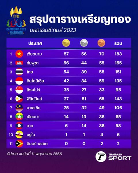 สรุปเหรียญ 5 อันดับแรก อันดับ 1 เวียดนาม 57 ทอง 56 เงิน 70 ทองแดง รวม 183 เหรียญ อันดับ 2 กัมพูชา (เจ้าภาพ) 56 ทอง 44 เงิน 55 ทองแดง รวม 155 เหรียญ อันดับ 3 ไทย 54 ทอง 39 เงิน 58 ทองแดง รวม 151 เหรียญ อันดับ 4 อินโดนีเซีย 42 ทอง 34 เงิน 59 ทองแดง รวม 136 เหรียญ อันดับ 5 สิงค์โปร 35 ทอง 27 เงิน 33 ทองแดง รวม 95 เหรียญ