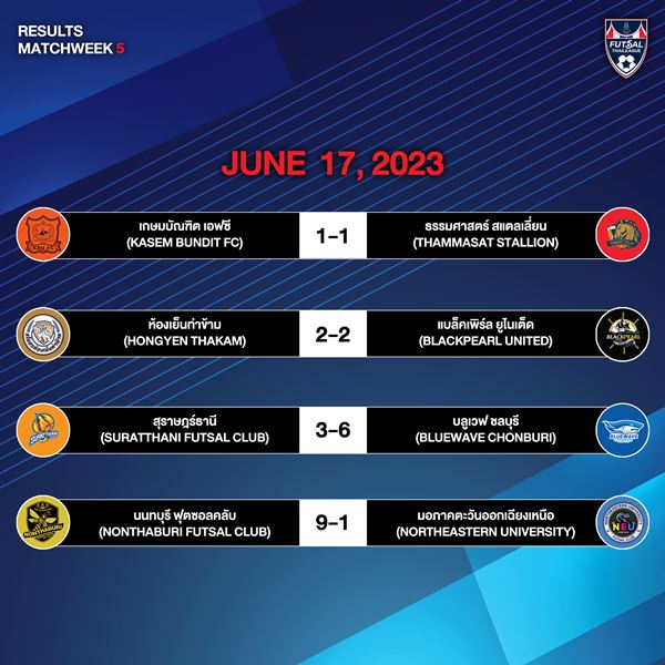 ส่วนผลการแข่งขันอีก 3 คู่ที่เหลือ เกษมบัณฑิต เอฟซี เสมอ ธรรมศาสตร์ สแตลเลี่ยน 1-1, ห้องเย็นท่าข้าม เสมอ แบล็คเพิร์ล ยูไนเต็ด 2-2 และนนทบุรี ฟุตซอลคลับ ชนะ มอภาคตะวันออกเฉียงเหนือ 9-1