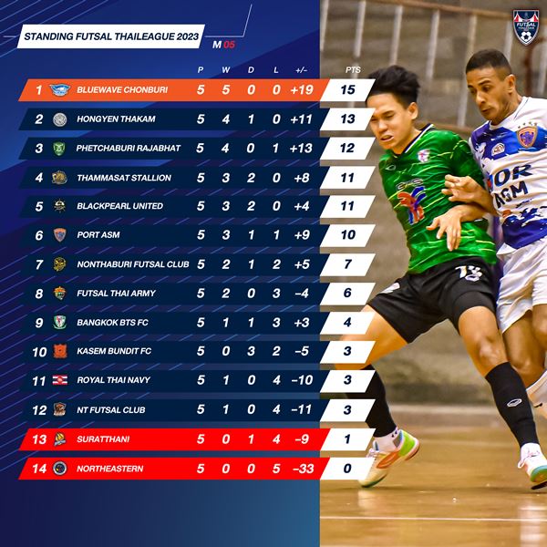 การท่าเรือ เอเอสเอ็ม แชมป์เก่าโกงความตาย ได้ อลงกรณ์ จันทร์พร รัวสองเม็ดครึ่งหลังตามตีเสมอ แบงค็อก บีทีเอส สุดมัน 2-2 โดยคู่นี้มีการอิมพอร์ตผู้ตัดสินฟีฟ่าจากเวียดนามมาทำหน้าที่ ขณะที่ ราชภัฎเพชรบุรี ฟอร์มยังฮอต วิลเลี่ยม ซัดแฮตทริกพาทีมบุกเฉือน เอ็นที ฟุตซอลคลับ 4-3 ฟุตซอลไทยลีก 2023 นัดที่ห้า