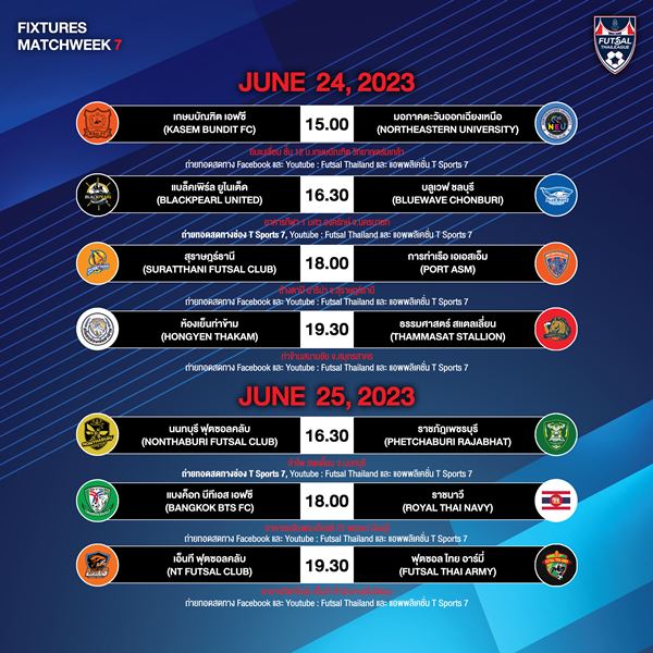 สำหรับโปรแกรมฟุตซอลไทยลีก2023 นัดที่เจ็ด ในวันเสาร์ที่ 24 มิ.ย.66 และ วันอาทิตย์ที่ 25 มิ.ย.66 มีแข่งขันทั้งหมด 7 คู่ โดยวันเสาร์ที่ 24 มิ.ย.66 เวลา 15.00 น. เกษมบัณฑิต เอฟซี พบ มอภาคตะวันออกเฉียงเหนือ ที่ยิมเนเซี่ยมชั้น 12 ม.เกษมบัณฑิต วิทยาเขตร่มเกล้า ถ่ายทอดสด Facebook และ Youtube Futsalthailand และ แอพพลิเคชั่น T Sports 7, เวลา 16.30 น. แบล็คเพิร์ล ยูไนเต็ด พบ บลูเวฟ ชลบุรี ที่อาคารกีฬา 1 มศว องครักษ์ จ.นครนายก ถ่ายทอดสด Facebook และ Youtube Futsalthailand, ช่องฟรีทีวี T Sports 7 และแอพพลิเคชั่น, เวลา 18.00 น. สุราษฎร์ธานี พบ การท่าเรือ เอเอสเอ็ม ที่ช้างตาปี อารีน่า จ.สุราษฎร์ธานี ถ่ายทอดสด Facebook และ Youtube Futsalthailand และ แอพพลิเคชั่น T Sports 7, เวลา 19.30 น. ห้องเย็นท่าข้าม พบ ธรรมศาสตร์ สแตลเลี่ยน ที่ท่าข้ามสนามชัย จ.สมุทรสาครถ่ายทอดสด Facebook และ Youtube Futsalthailand และ แอพพลิเคชั่น T Sports 7