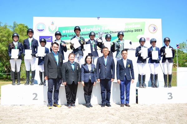 มอบรางวัลกีฬาขี่ม้า กีฬาระหว่างโรงเรียน ประเภทกระโดดข้ามเครื่องกีดขวาง ดร.วนิดา พันธ์สอาด รองอธิบดีกรมพลศึกษา เป็นประธานในการมอบเหรียญรางวัลในการแข่งกีฬาขี่ม้า กีฬาระหว่างโรงเรียน DPE Inter-School Equestrian Championship 2023 ประเภทกระโดดข้ามเครื่องกีดขวาง (Jumping) ประเภททีม อายุ 8 – 18 ปี