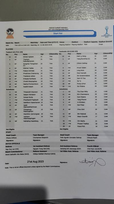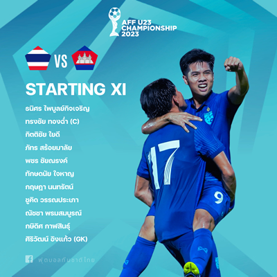 Line_Up รายชื่อ 11 ตัวจริง 🇹🇭 ทีมชาติไทย U23 พบ กัมพูชา U23 🇰🇭 ศึกฟุตบอลชิงแชมป์อาเซียน รุ่นอายุไม่เกิน 23 ปี กลุ่ม เอ เกมที่สาม