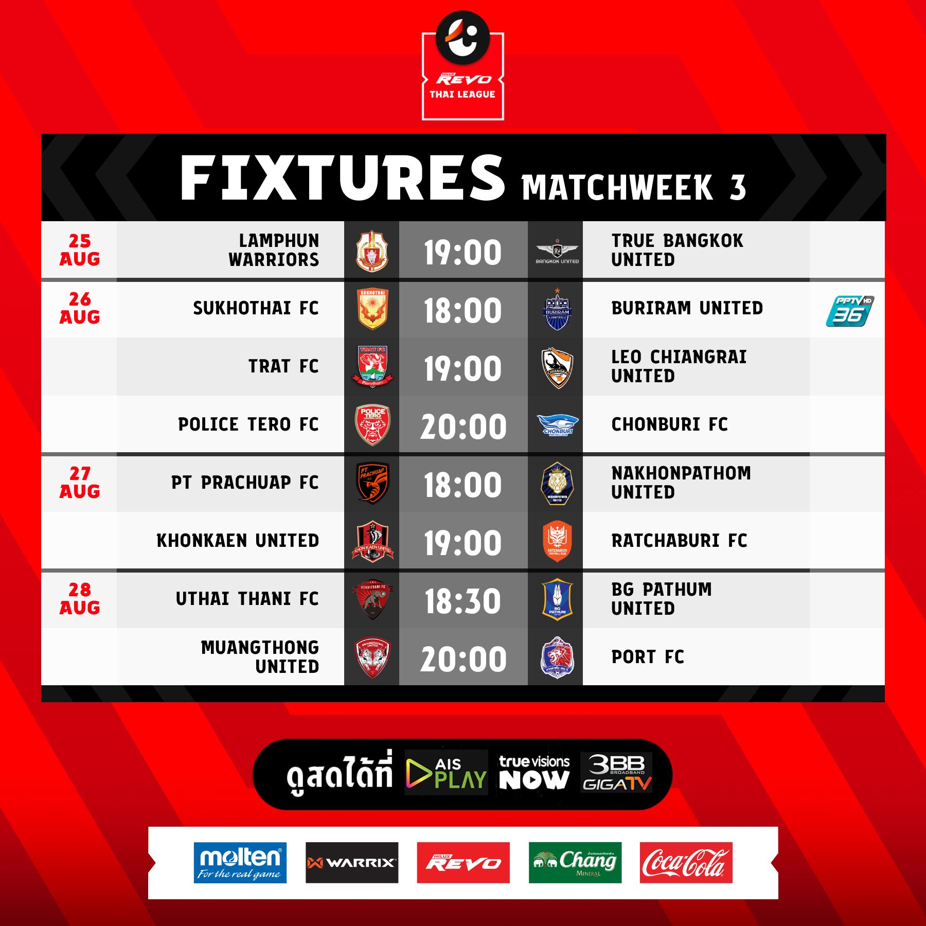 แมตช์ 3 ของ รีโว่ ไทยลีก ก่อนหลีกทางให้กับทีมชาติไทย