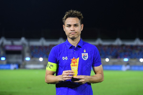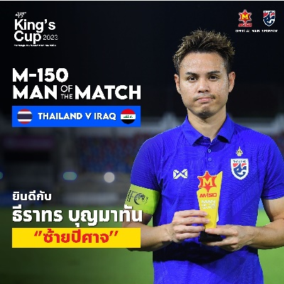ธีราทร บุญมาทัน กัปตันทีมชาติไทย คว้ารางวัล M-150 Man of The Match รางวัลนักเตะพลังฮึดสู้ หลังโชว์ฟอร์มได้อย่างยอดเยี่ยมในเกมนัดชิงชนะเลิศ ฟุตบอลคิงส์คัพ ครั้งที่ 49