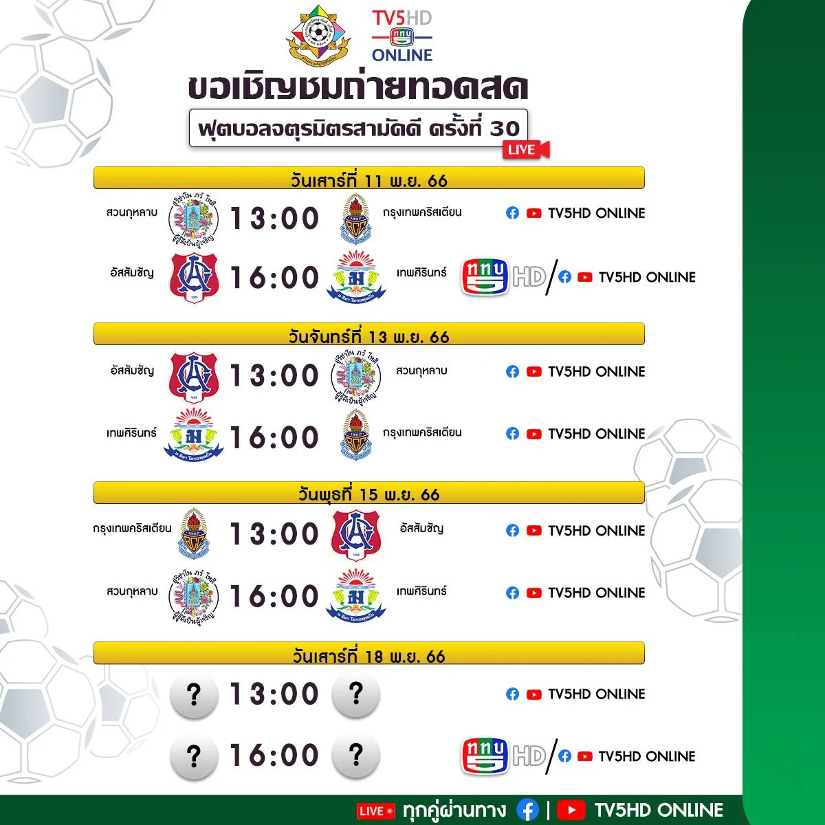 สถานีวิทยุโทรทัศน์กองทัพบก (ททบ.5) ขอเชิญชมการถ่ายทอดสด พิธีเปิด และพิธีปิด การแข่งขันฟุตบอลจตุรมิตรสามัคคี ครั้งที่ 30 ได้ทาง Free TV ช่อง 5 (TV5HD) และสามารถชมการแข่งขันฟุตบอลได้ทุกคู่ ที่เฟสบุ๊ค และยูทูป TV5HD Online ตามโปรแกรมถ่ายทอดสด ดังนี้