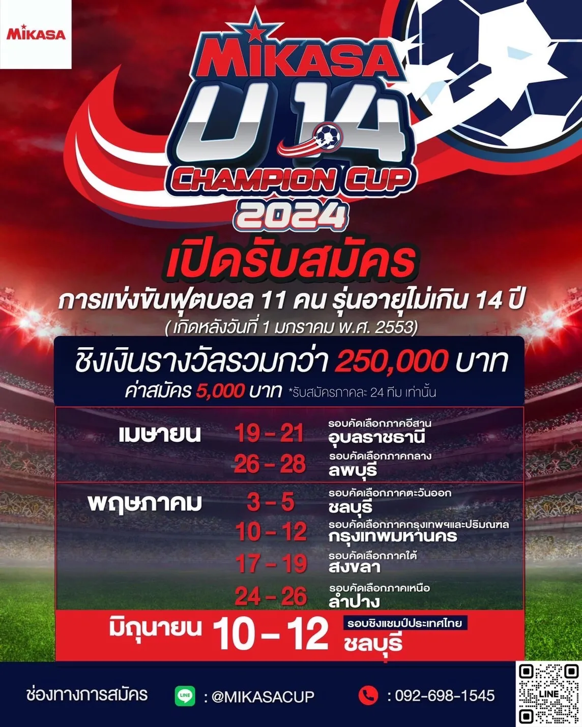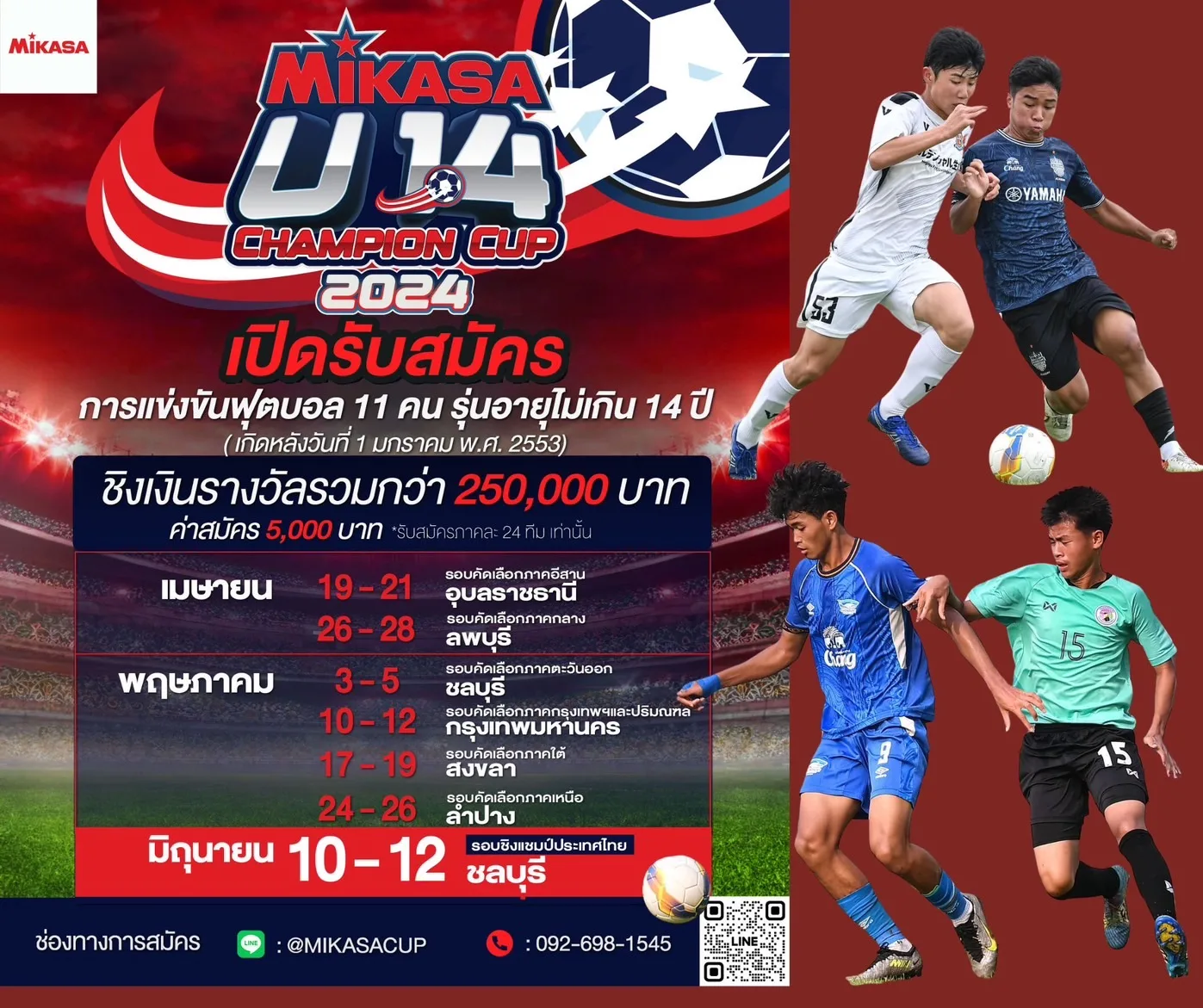 “โค้ชโย่ง” วรวุธ ศรีมะฆะ อดีตดาวยิงและกุนซือทีมชาติไทย ในฐานะแบรนด์แอมบาสเดอร์ MIKASA ประกาศเชิญชวนเยาวชนทั่วประเทศเข้าร่วมการแข่งขันฟุตบอลเยาวชนรุ่นอายุไม่เกิน 14 ปี “MIKASA U14 CHAMPION CUP 2024” ชิงเงินรางวัลรวมกว่า 250,000 บาท