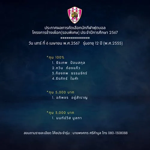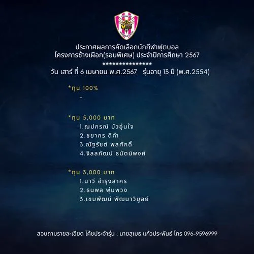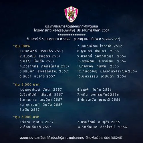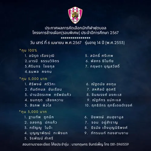 อ.คนอง ตนเล็ก บอสใหญ่วชิราลัย ประกาศผลการคัดเลือกนักกีฬาโครงการช้างเผือกประจำปี 2567 (รอบพิเศษ) ประจำวันเสาร์ที่ 6 เมษายน พ.ศ.2567 รุ่นอายุ 10 -14 ปี ขอให้นักกีฬาที่มีรายชื่อ ติดต่อโค้ชประจำรุ่น เพื่อสอบถามรายละเอียด ตามเบอร์โทรศัพท์ที่ลงในประกาศ และตรวจสอบรายชื่อทุกรุ่นที่ผ่านการคัดเลือก