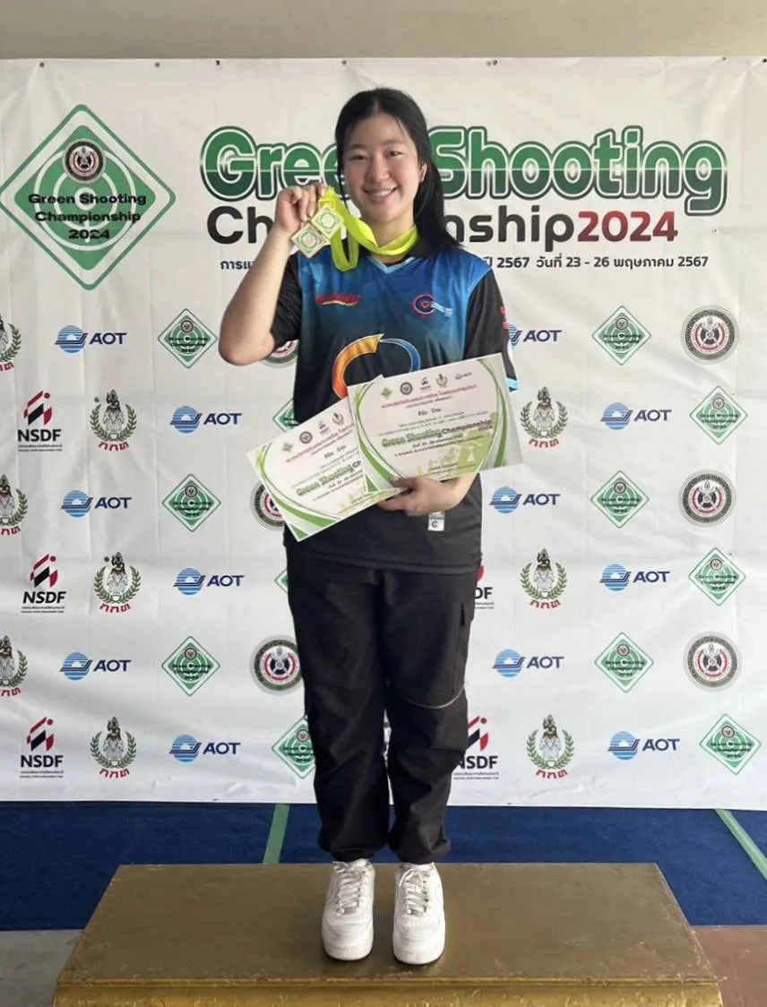 น.ส.ดีพิม นิยม (น้องพิม) นักเรียนชั้นม.6/4 โรงเรียนมงฟอร์ต วิทยาลัย เชียงใหม่ ที่ได้เข้าร่วมแข่งขันกีฬายิงปืนชิงแชมป์เยาวชน รายการ4th Green Shooting Championship2024