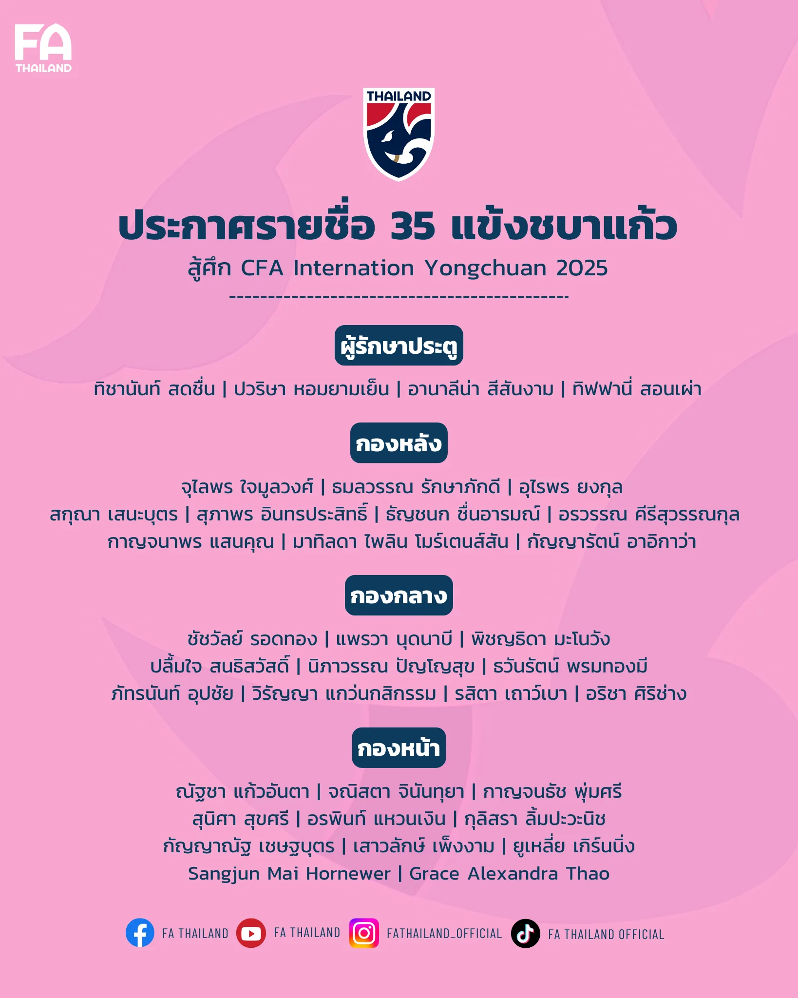 OFFICIAL ประกาศ : รายชื่อ 35 แข้ง ฟุตบอลหญิงทีมชาติไทย เก็บตัวฝึกซ้อม เตรียมลุยศึก CFA Internation Yongchuan 2025 ที่จีน
