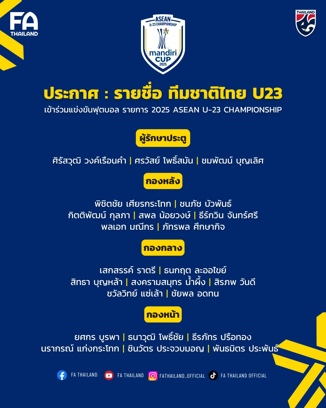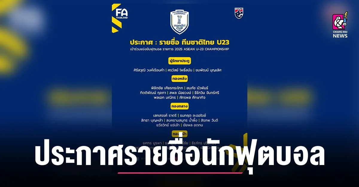 สมาคมกีฬาฟุตบอลแห่งประเทศไทย ในพระบรมราชูปถัมภ์ ประกาศรายชื่อ 23 นักฟุตบอลชายทีมชาติไทยรุ่นอายุไม่เกิน 23 ปี ชุดทำการแข่งขันฟุตบอลชิงแชมป์อาเซียน (2025 ASEAN U-23 Championship) ระหว่างวันที่ 15-29 กรกฎาคม 2568 ภายใต้ การคุมทัพของ “โค้ชวัง” ธวัชชัย ดำรงอ่องตระกูล