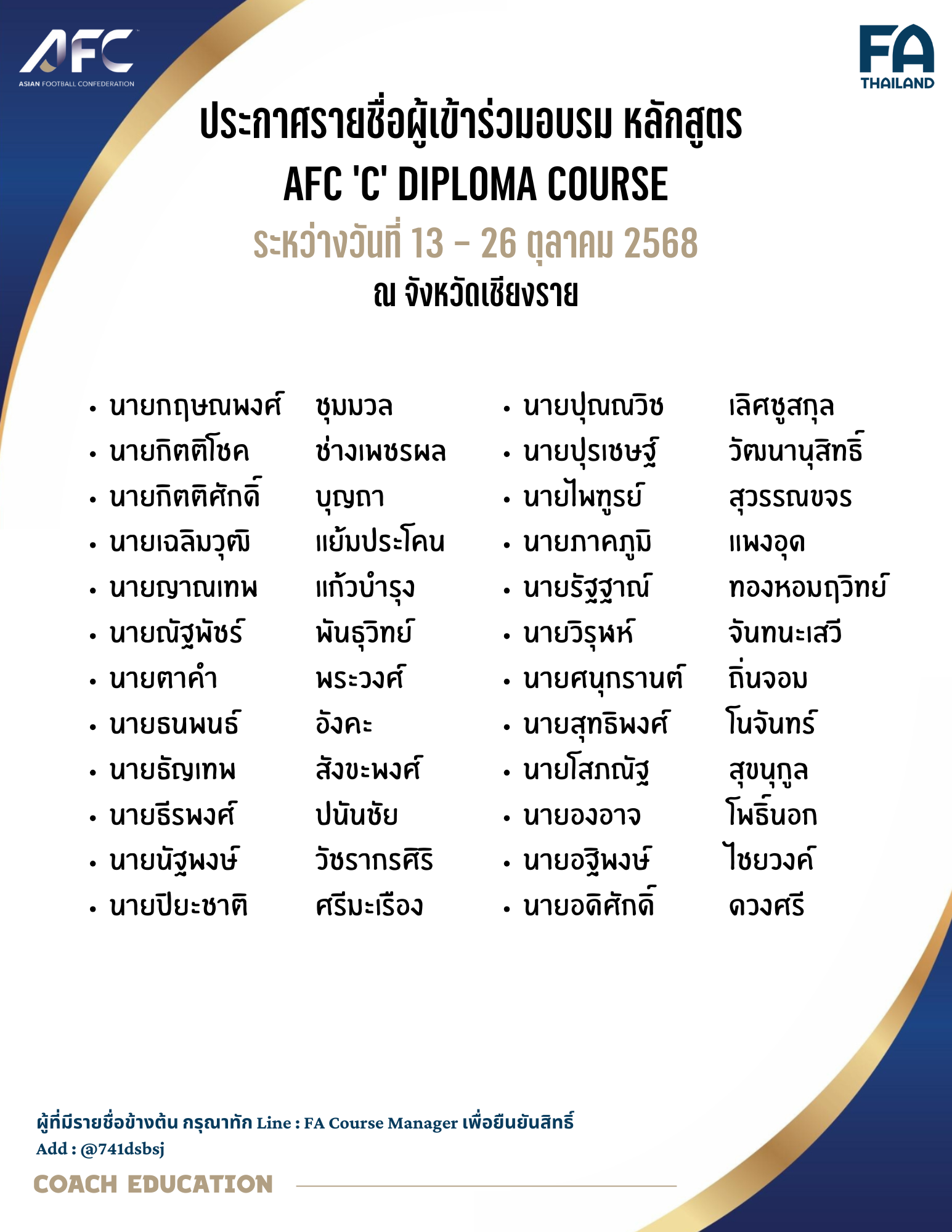 ฝ่ายฝึกอบรม สมาคมกีฬาฟุตบอลแห่งประเทศไทยฯ ประกาศรายชื่อ ผู้ฝึกสอน ที่ผ่านคุณสมบัติ เข้าร่วมการอบรมผู้ฝึกสอน หลักสูตร AFC ‘C’ Diploma ครั้งที่ 8/2568 ระหว่างวันที่ 13 – 26 ตุลาคม 2568 ณ จังหวัดเชียงราย