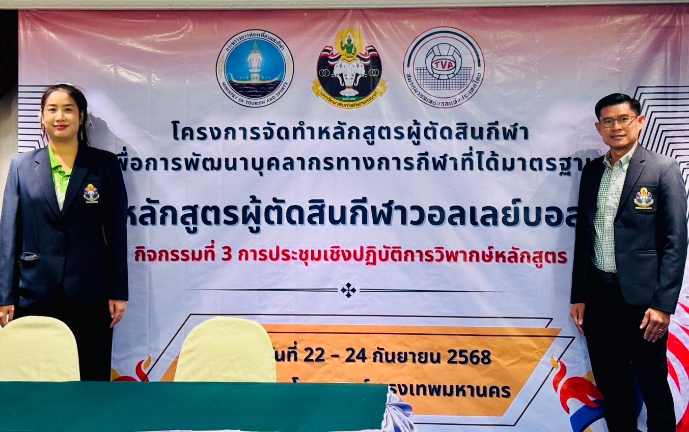 นายนรินทร์ แสงศรีจันทร์ รักษาราชการแทนรองอธิการบดี มหาวิทยาลัยการกีฬาแห่งชาติ ประจำวิทยาเขตเชียงใหม่ มอบหมายให้อาจารย์ธนกร ปัญญาวงค์ และอาจารย์มาริษา ชัยแก้ว เข้าร่วมโครงการจัดทำหลักสูตรผู้ตัดสินกีฬา เพื่อการพัฒนาบุคลากรทางการกีฬาที่ได้มาตรฐาน “หลักสูตรผู้ตัดสินกีฬาวอลเลย์บอล” กิจกรรมที่ 3 การประชุมเชิงปฏิบัติการวิพากษ์หลักสูตร ระหว่างวันที่ 22 – 24 กันยายน 2568 ณ โรงแรมเมโทรพอยด์ เขตบางกะปิ กรุงเทพมหานคร