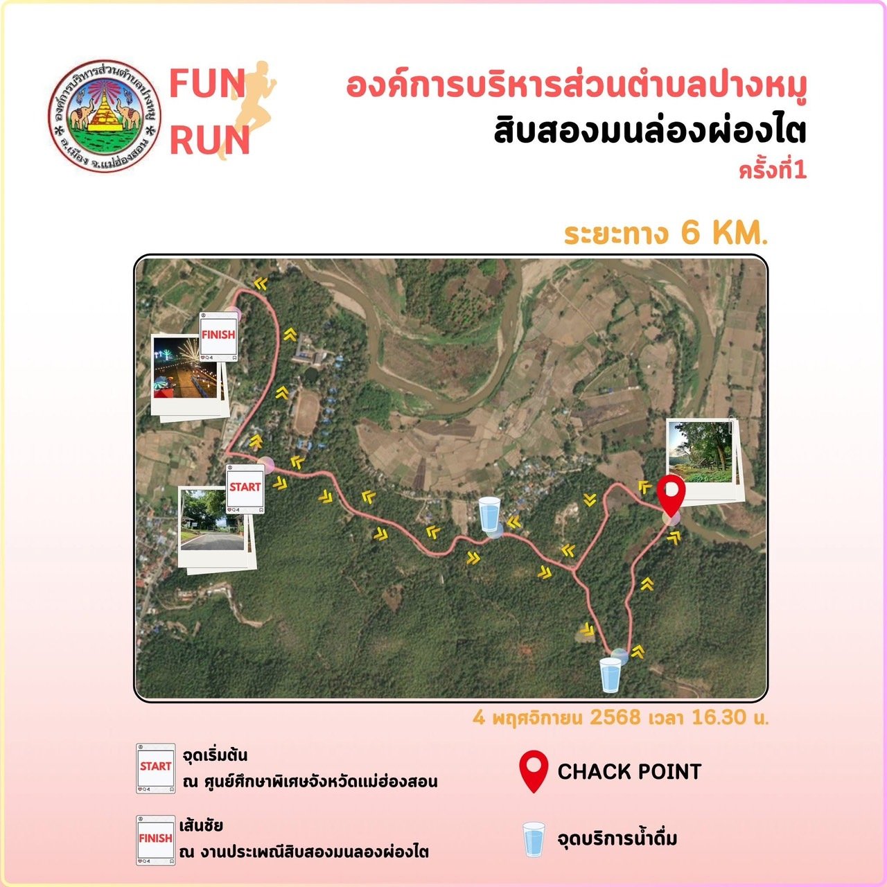 วันที่ 3 ตุลาคม 2568 นายสุริยะกาญจน์ มาลาวัลย์ ปลัดองค์การบริหารส่วนตำบลปางหมู ได้เปิดเผยว่า องค์การบริหารส่วนตำบลปางหมู ต.ปางหมู อำเภอเมือง จังหวัดแม่ฮ่องสอน ได้กำหนดจัดกิจกรรม FUN RUN สิบสองมน ล่องผ่องไตครั้งที่ 1 ประจำปี 2568 เพื่อส่งเสริมการออกกำลังกายควบคู่ไปกับการอนุรักษ์ประเพณีวัฒนธรรมของท้องถิ่นเอาไว้ โดยมีกำหนดการจัดกิจกรรมดังนี้