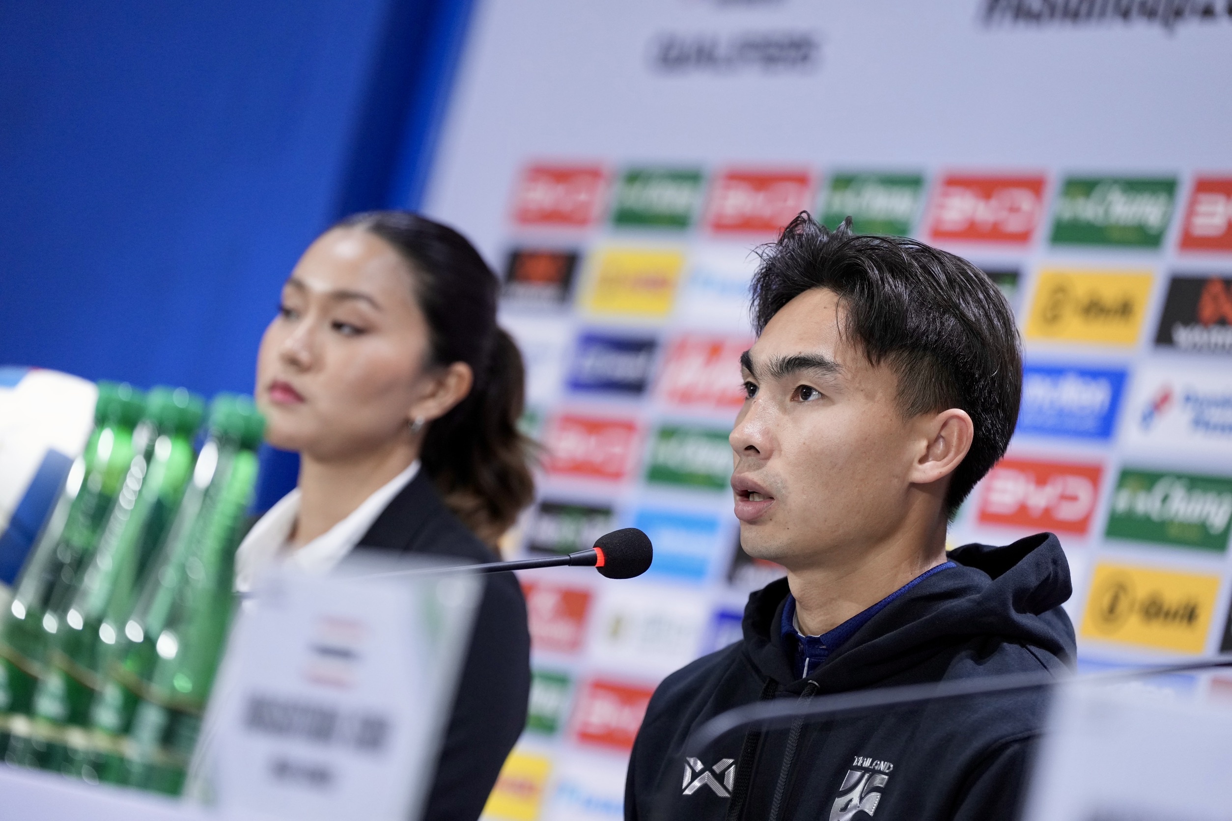 การแถลงข่าวครั้งนี้นำโดย “มาซาทาดะ อิชิอิ” หัวหน้าผู้ฝึกสอนทีมชาติไทย พร้อมด้วย “เจริญศักดิ์ วงษ์กรณ์” แนวรุกของทีม
