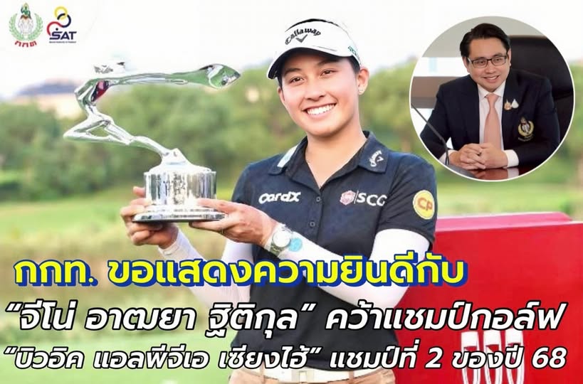 กกท. ขอแสดงความยินดี“จีโน่ อาฒยา ฐิติกุล” คว้าแชมป์กอล์ฟ บิวอิค แอลพีจีเอ เซียงไฮ้” แชมป์ที่ 2 ของปี 68ดร. ก้องศักด ยอดมณี ผู้ว่าการการกีฬาแห่งประเทศไทย (กกท.) ขอแสดงความยินดีกับ “โปรจีโน่” อาฒยา ฐิติกุล โปรสาวไทย มือ 1 ของโลก คว้าแชมป์กอล์ฟ รายการบิวอิค แอลพีจีเอ เซี่ยงไฮ้ ไปครอง ในการแข่งขันกอล์ฟแอลพีจีเอทัวร์ รายการบิวอิค แอลพีจีเอ เซี่ยงไฮ้ ชิงเงินรางวัลรวม 2.2 ล้านดอลลาร์สหรัฐ (ประมาณ 71.4 ล้านบาท) ที่สนามฉีจง การ์เด้น กอล์ฟ คลับ พาร์ 72 นครเซี่ยงไฮ้ สาธารณรัฐประชาชนจีน เมื่อวันที่ 12 ตุลาคม 2568 ที่ผ่านมา