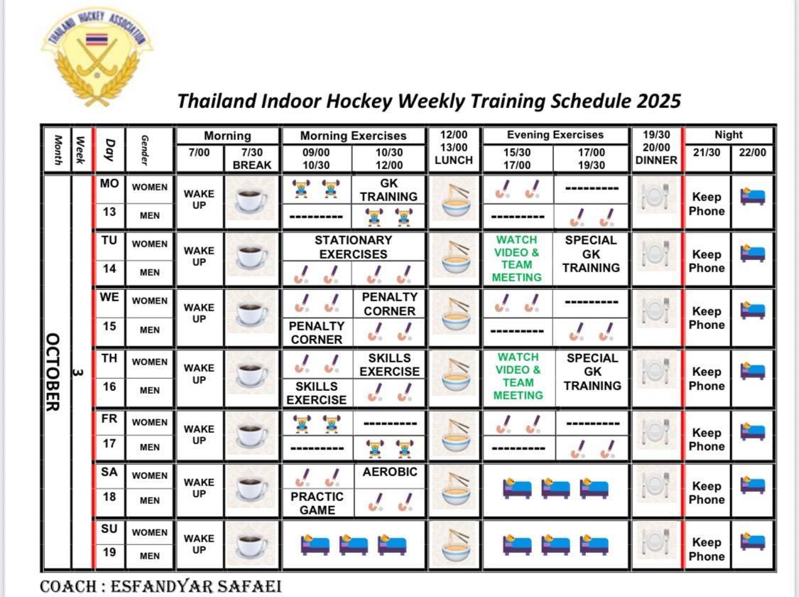 นายกองเอกชัยภักดิ์ ศิริวัฒน์ ได้กล่าวเพิ่มเติมว่าทางสมาคมไม่ได้หยุดนิ่งเพียงแค่นี้เราได้เชิญนักกีฬาอินดอร์ฮอกกี้ชุด World Cup ของประเทศ Iran มาลงทีมฝึกซ้อมและเติมเทคนิคให้นักกีฬา อินดอร์ฮอกกี้ทีมชาติไทยทั้งชายและหญิงชุด ซีเกมส์ตลอดทั้งเดือนตุลาคมนี้ที่ศูนย์ฝึกกีฬาฮอกกี้อำเภอวังม่วง สระบุรี เพื่อที่ให้ทีมไทยของเรามีความแข็งแกร่งมากขึ้น นี่ถือว่าทีใไทยโชคดีมากที่นักกีฬาระดับเวิลด์คัพจะยกทีมมาร่วมสอนแท๊คติกและชั้นเชิงระดับโลกให้กับทีมชาติไทยแบบมีตารางการฝึกซ้อมอย่างเข้มข้นเพื่อเป้าหมายในการคว้าเหรียญทองให้สำเร็จดั่งมุ่งหมาย 100%