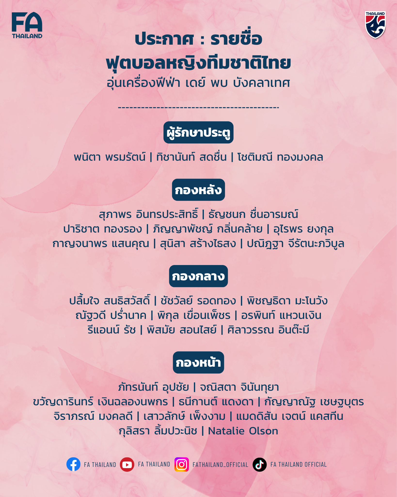 OFFICIAL! ประกาศ : รายชื่อ 30 แข้ง ฟุตบอลหญิงทีมชาติไทย ชุดอุ่นเครื่องฟีฟ่า เดย์ พบ บังคลาเทศ