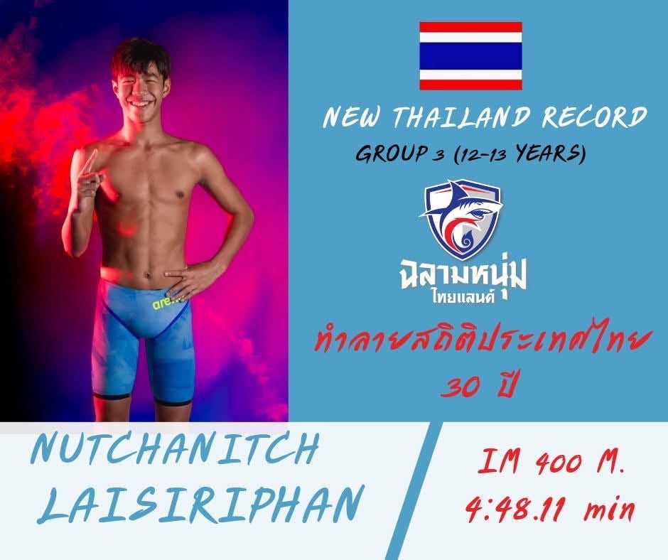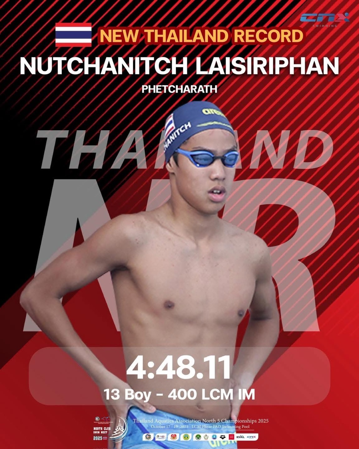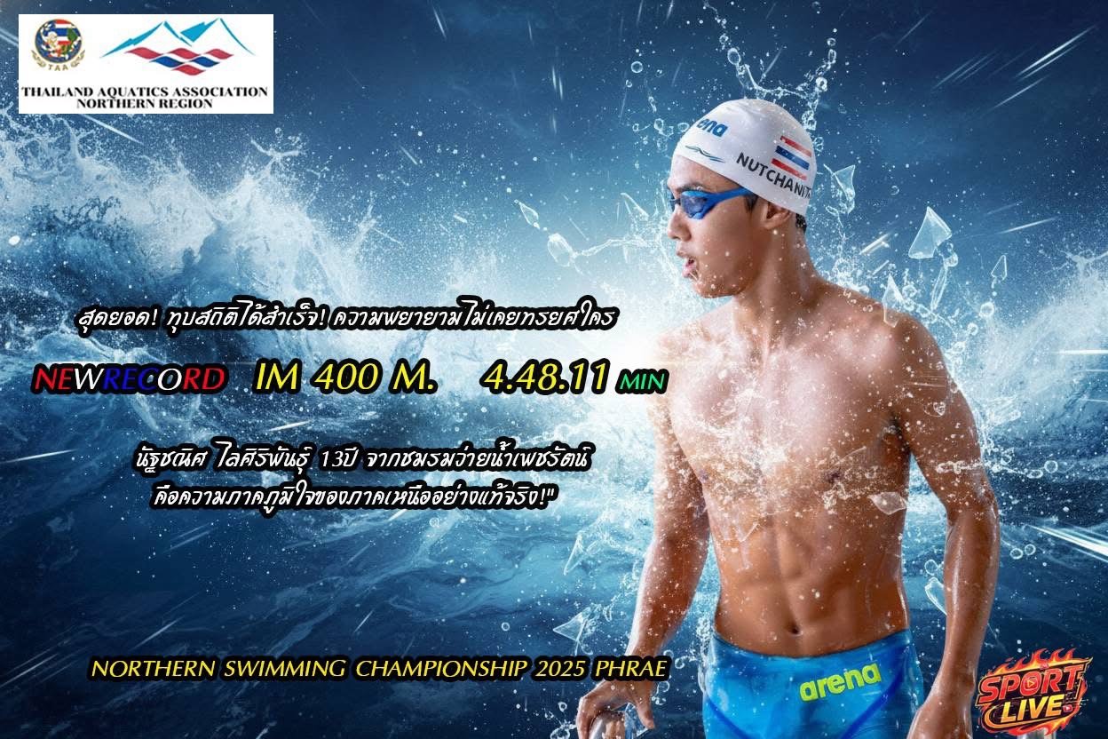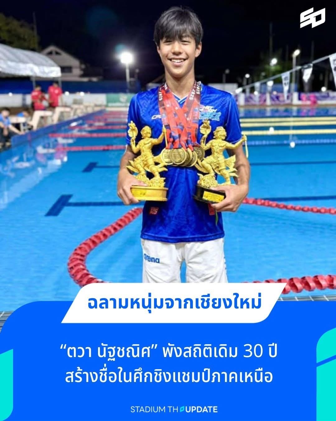 ฉลามหนุ่มจากเชียงใหม่ “ตวา นัฐชณิศ” พังสถิติเดิม 30 ปี สร้างชื่อในศึกชิงแชมป์ภาคเหนือ ขอแสดงความยินดีกับ “ตวา – นัฐชณิศ ไลศิริพันธุ์” นักกีฬาว่ายน้ำสมาคมกีฬาว่ายน้ำ ภาคเหนือ จังหวัดเชียงใหม่ ที่สามารถสร้าง สถิติประเทศไทยใหม่ ในประเภท เดี่ยวผสม 400 เมตร รุ่นอายุ 12–13 ปีชาย จากการแข่งขัน ว่ายน้ำชิงแชมป์ภาคเหนือ ประจำปี 2568 ซึ่งจัดขึ้นที่จังหวัดแพร่ เมื่อสัปดาห์ที่ผ่านมา