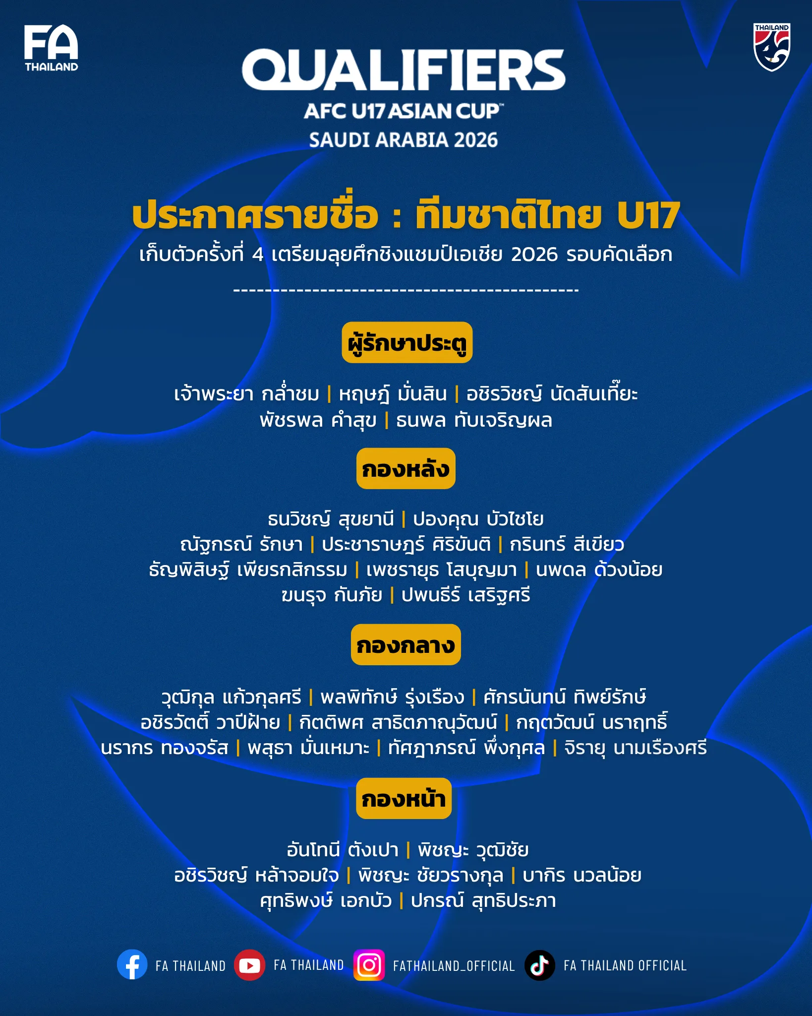 สมาคมกีฬาฟุตบอลแห่งประเทศไทย ในพระบรมราชูปถัมภ์ ประกาศรายชื่อ 32 นักฟุตบอลชายทีมชาติไทย รุ่นอายุไม่เกิน 17 ปี เก็บตัวฝึกซ้อม เพื่อเตรียมความพร้อมก่อนทำการแข่งขันฟุตบอลชายชิงแชมป์เอเชียรุ่นอายุไม่เกิน 17 ปี รอบคัดเลือก (AFC U17 Asian Cup Saudi Arabia 2026 Qualifiers) ระหว่างวันที่ 22-30 พฤศจิกายน 2568