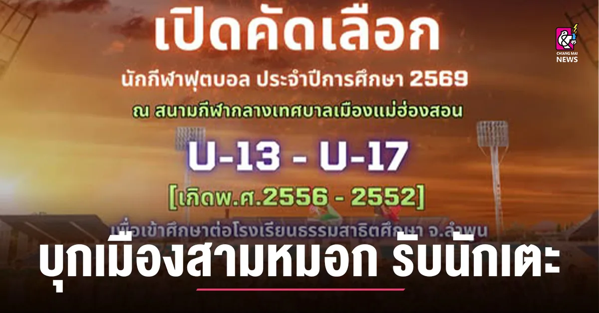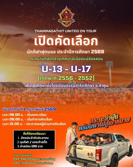 ธรรมสาธิต ยูไนเต็ด สานฝัน เด็กวัดหัวใจนักสู้ สู่ถนนลูกหนัง ดร.พระปลัดศิวนัฐ ประธานพร้อมลุย บุกข้ามดอยพันกว่าโค้ง สู่เมืองสามหมอก แม่ฮ่องสอน เปิดคัดตัวนักเตะในวันที่ 1 กุมภาพันธ์ 2569 สโมสรธรรมสาธิต ยูไนเต็ด ทีมดังแห่งเมืองลำพูน สานฝันเด็กด้อยโอกาส สู่ถนนลูกหนังอาชีพ มาสมัครเข้าร่วม ทีมธรรมสาธิต ยูไนเต็ด เด็กวัดหัวใจนักสู้ ฉายา นกยูงไฟ แห่งนครเจดีย์ อำเภอป่าซาง จ.ลำพูน