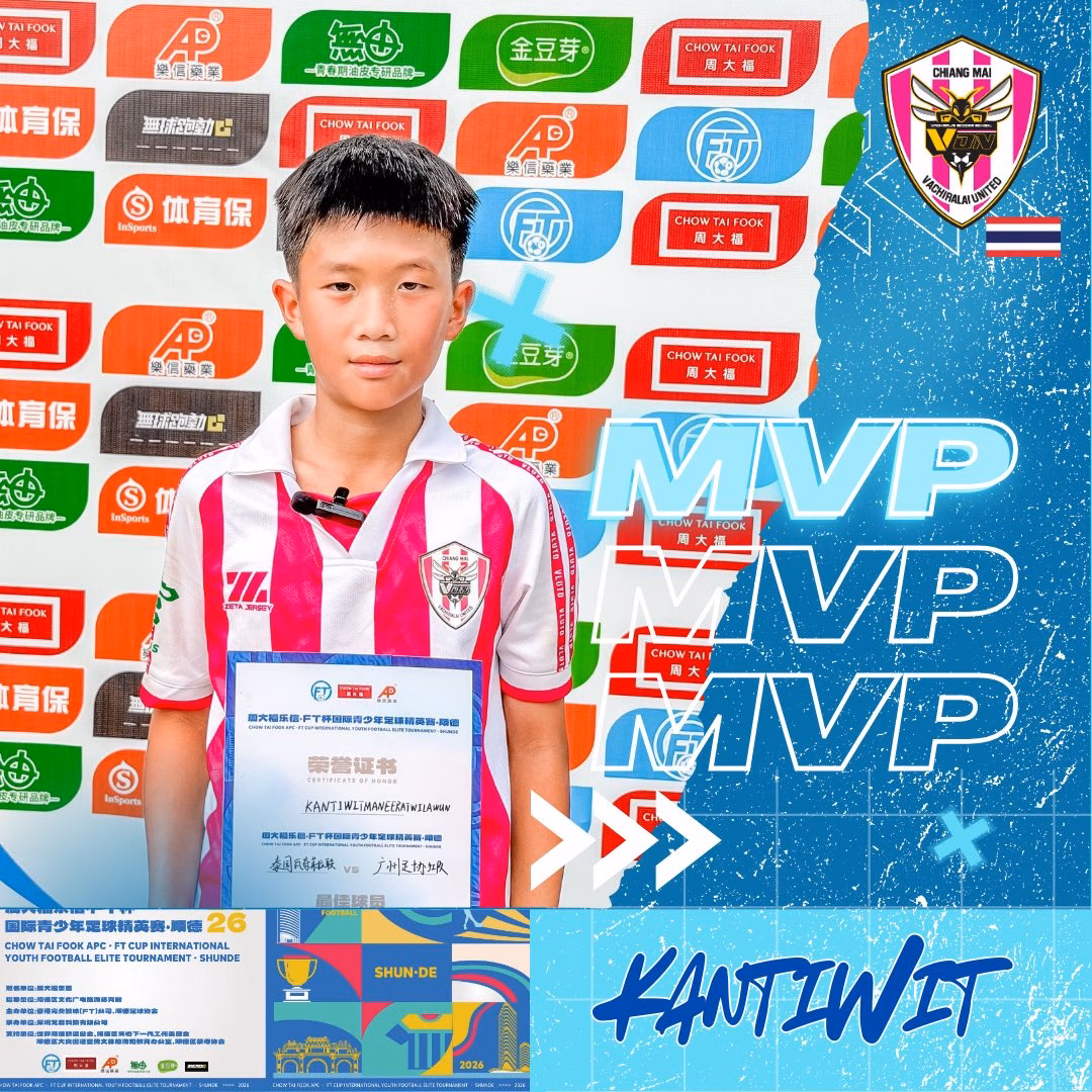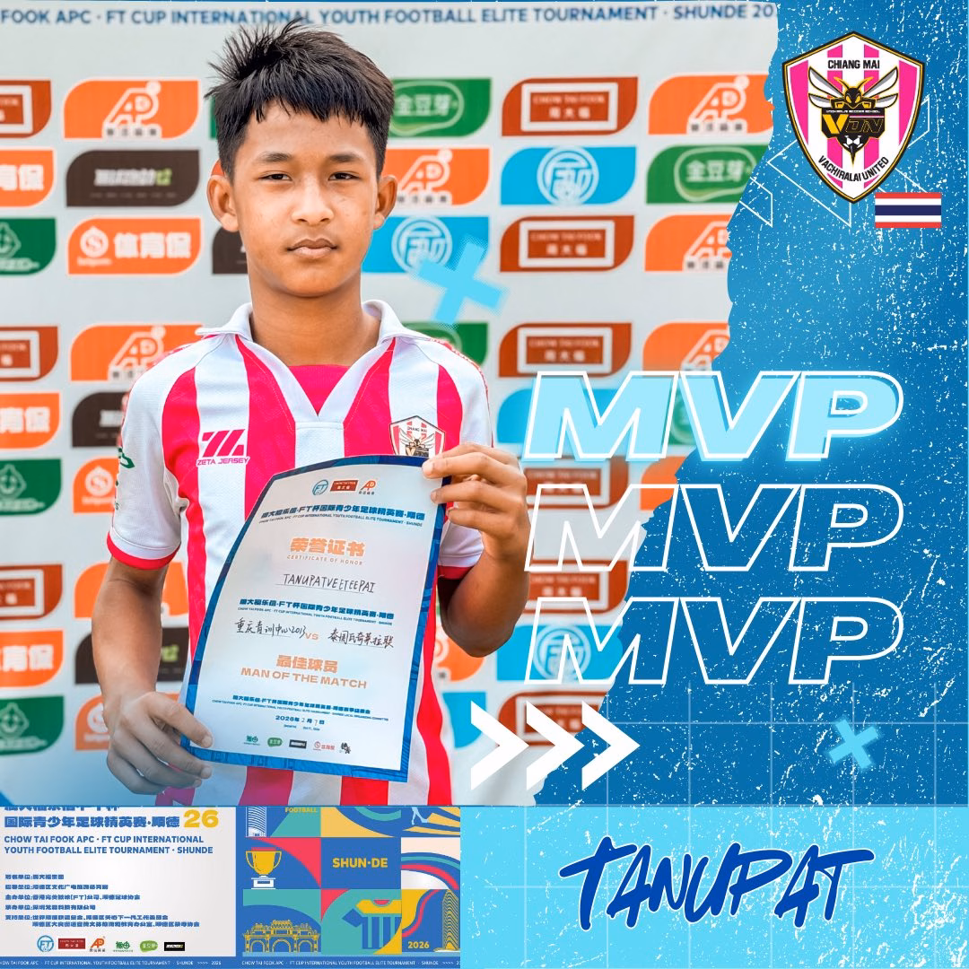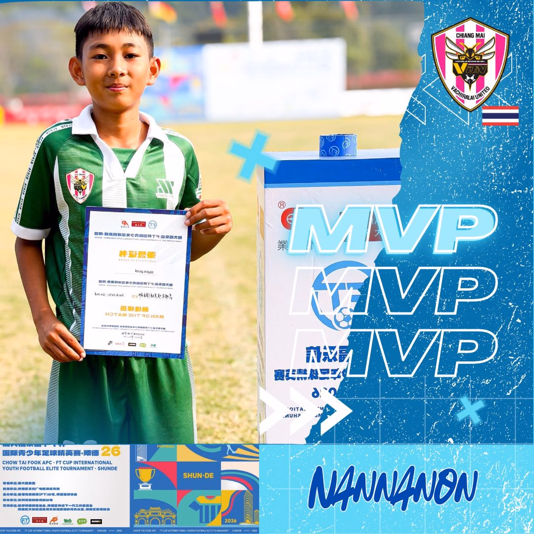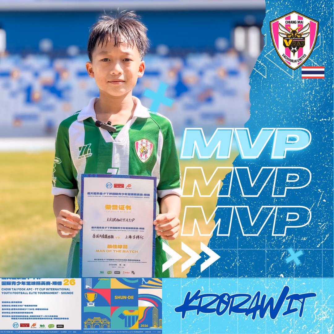 บอสใหญ่ วชิราลัย คนอง ตนเล็ก ร่วมแสดงความยินดีกับน้องๆ U-13 ที่นำทีมโดยโค้ชทิวประภากร รัตนพันธ์ นำทีมแข้งละอ่อนเชียงใหม่ ที่คว้ารางวัลนักเตะยอดเยี่ยม กับทัวร์นาเมนต์ การแข่งฟุตบอล “Chow Tai Fook APC FT Cup, Shunde 2026” ณ เมืองซุ่นเต๋อ มณฑลกว่างตง สาธารณรัฐประชาชนจีน