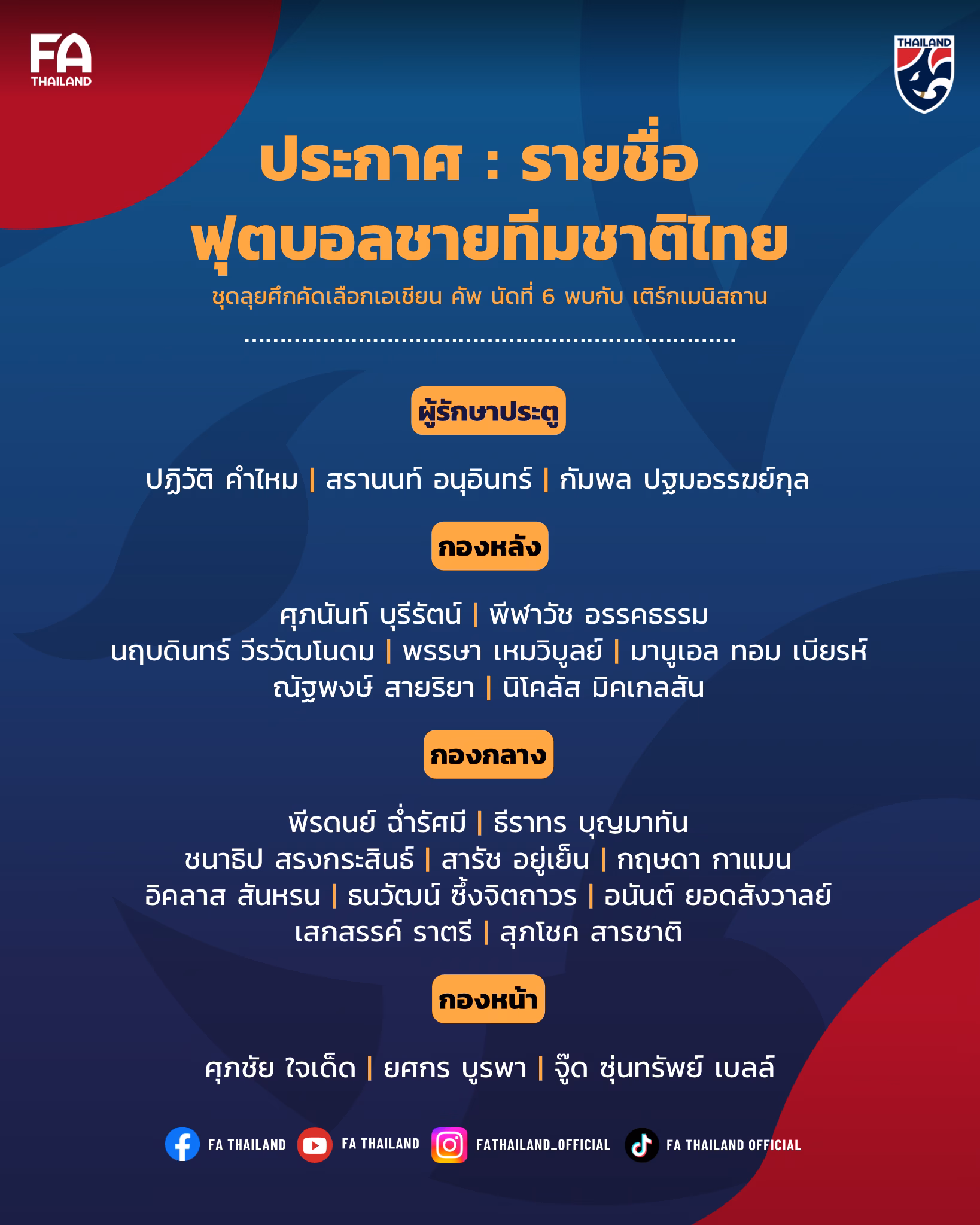ประกาศ รายชื่อ 23 นักเตะทีมชาติไทย ชุดชี้ชะตาศึกเอเชียน คัพ รอบคัดเลือก พบกับ เติร์กเมนิสถาน