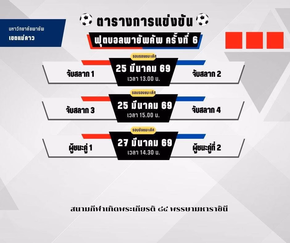 ศึกลูกหนัง นัดยิ่งใหญ่ ในรุ่น ยู 18 ปี PAYAP CUP #6 เปิดศึกแล้ว! ศึกฟุตบอลสุดมันส์ ที่จะมาวัดฝีเท้ากันแบบไม่มีใครยอมใคร เริ่มดวลแข้ง 17–18 มีนาคม 2569 สนามกีฬาเทิดพระเกียรติ 88 พรรษามหาราชินี มหาวิทยาลัยพายัพ เขตแม่ดาว ใครจะทะลุเข้ารอบ ใครจะคว้าแชมป์ ไปครองในปีนี้ มาเชียร์ให้สนั่นสนามกันได้เลยที่ กีฬาเทิดพระเกียรติ 88 พรรษามหาราชินี ม.พายัพ