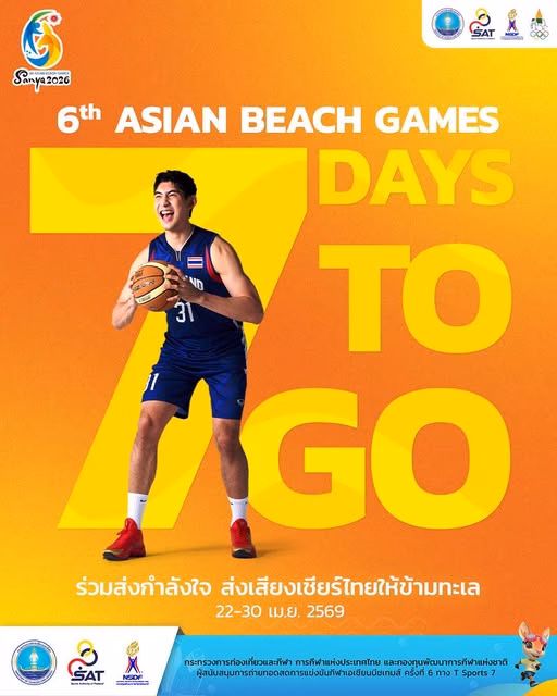 เตรียมพบความมันส์ของกีฬาชายหาดระดับเอเชีย และร่วมส่งกำลังใจเชียร์ทัพนักกีฬาทีมชาติไทยในการแข่งขันกีฬา Asian Beach Games ครั้งที่ 6 ณ เมืองซานย่า สาธารณรัฐประชาชนจีน ระหว่างวันที่ 22–30 เมษายน 2026 และติดตามรายละเอียดทั้งหมดของการแข่งขันได้ทาง เฟซบุ๊คแฟนเพจ กองประชาสัมพันธ์ กกท. สานพลังเชียร์ไทยคว้าชัยเอเชียนบีชเกมส์