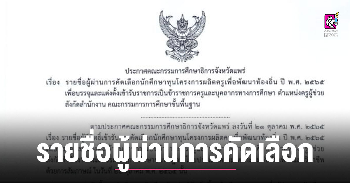 กศจ.แพร่ ประกาศรายชื่อผู้ผ่านการคัดเลือกครูพัฒนาท้องถิ่น