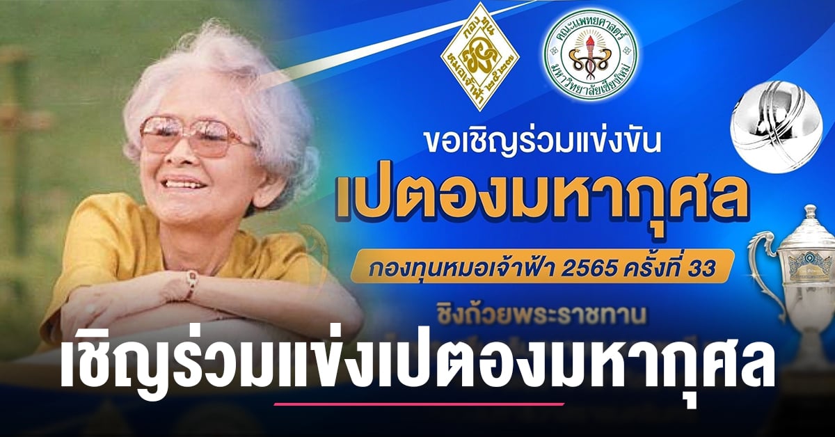 คณะเเพทยศาสตร์ มหาวิทยาลัยเชียงใหม่ ขอเชิญร่วมแข่งขัน เปตองมหากุศล กองทุนหมอเจ้าฟ้า 2565 ครั้งที่ 33 ชิงถ้วยพระราชทาน สมเด็จพระศรีนครินทราบรมราชชนนี และ สมเด็จพระเจ้าพี่นางเธอ เจ้าฟ้ากัลยาณิวัฒนา กรมหลวงนราธิวาสราชนครินทร์ วันเสาร์ที่ 22-อาทิตย์ที่ 23 ตุลาคม 2565ณ สนามเปตองชั่วคราว ข่วงพะยอม หอนิทรรศการศิลปวัฒนธรรม มหาวิทยาลัยเชียงใหม่