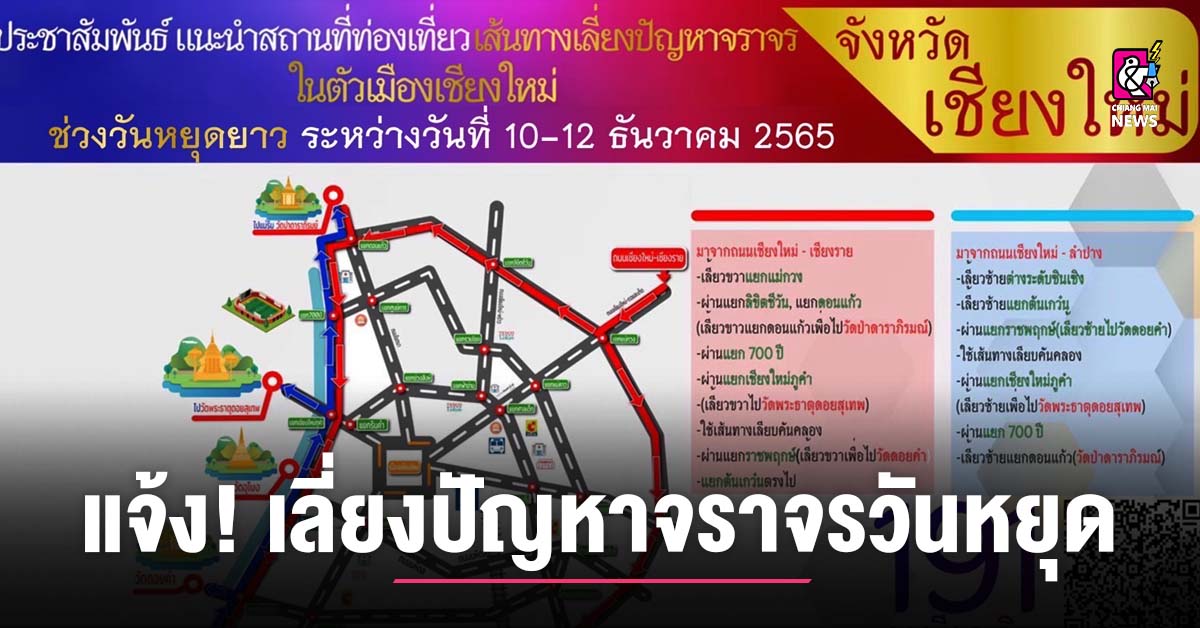 จราจรเชียงใหม่ ประชาสัมพันธ์ เป็นข้อมูล ในการวางแผนการเดินทางในช่วงวันหยุดต่อเนื่อง 3 วัน ช่วงระหว่างวันที่ 10-12 ธันวาคม 2565 เพื่อแก้ไขปัญหาการจราจร และป้องกันการเกิดอุบัติเหตุร่วมกัน