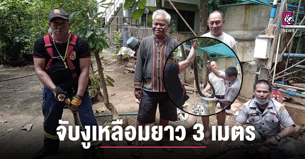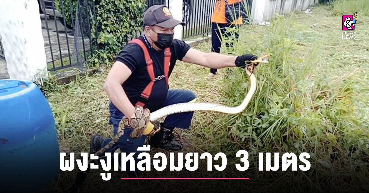 (มีคลิป) คนงานตัดหญ้า ผงะงูเหลือมยาว 3 เมตรมาก่อกวนแจ้งกู้ภัยจับ