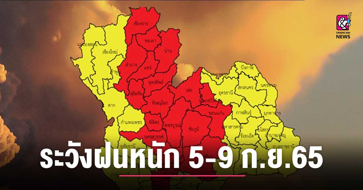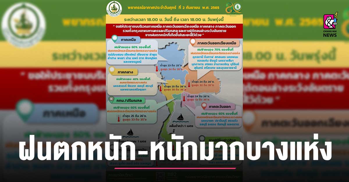พยากรณ์อากาศ ระวังฝนตกหนักทั่วไทยวันที่ 5-9 กันยายน 256ซึ่งประกาศกรมอุตุนิยมวิทยา เรื่อง ฝนตกหนักถึงหนักมากบริเวณประเทศไทย และคลื่นลมแรงบริเวณทะเลอันดามันตอนบนและอ่าวไทยตอนบน ฉบับที่ 5 (229/2565) จะมีผลกระทบตั้งแต่วันที่ 5-9 กันยายน 2565 ระวังภาคเหนือ: จังหวัดแม่ฮ่องสอน เชียงใหม่ เชียงราย ลำพูน ลำปาง พะเยา น่าน แพร่ สุโขทัย อุตรดิตถ์ตาก กำแพงเพชร พิจิตร พิษณุโลก และเพชรบูรณ์