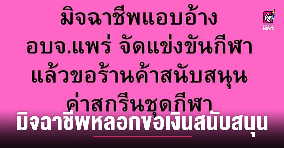 ผู้สื่อข่าวรายงานว่าเมื่อวันที 2เมษายน 2567 เพจ อบจ.แพร่ ได้โพสต์ข้อความว่า โปรดระวังมิจฉาชีพ เนื่องจากมีการแอบอ้างว่า อบจ.แพร่ จัดการแข่งขันกีฬา อบจ.แพร่ ขอเรียนให้แฟนเพจ และประชาชนชาว จ.แพร่ ทราบว่า ช่วงนี้ อบจ.แพร่ ไม่ได้จัดให้มีการแข่งขันกีฬาประเภทใด ๆ ดังนั้น หากท่านได้รับข้อความในลักษณะตามภาพ อย่าหลงเชื่อเป็นอันขาด และขอความร่วมมือกดรายงานผู้ใช้บัญชีนั้นทันที ซึ่งมิจฉาชีพจะทักแชทไปหากิจการร้านค้าต่าง ๆ เพื่อขอรับการสนับสนุนในการสกรีนชุดกีฬา