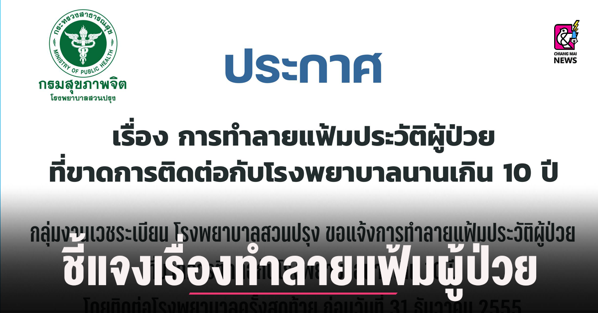 ประกาศ รพ.สวนปรุง เรื่อง การทำลายแฟ้มประวัติผู้ป่วย ที่ขาดการติดต่อ 10 ปี