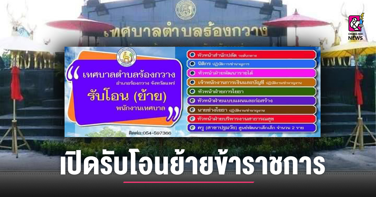 ทต.ร้องกวาง จ.แพร่ เปิดรับโอนย้ายข้าราชการ จำนวน 10 ตำแหน่ง