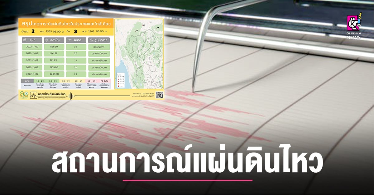 สำหรับสถานการณ์แผ่นดินไหวในช่วงวันที่ 2-3 พฤศจิกายน 2565 ตรวจพบเหตุการณ์แผ่นดินไหว ขนาด 2.9 มีศูนย์กลางอยู่ที่ สปป.ลาว ขนาด 2.6, 2.7, 2.0 และ 2.1 มีศูนย์กลางอยู่ที่ประเทศเมียนมา ไม่มีผลกระทบต่อประเทศไทยแต่อย่างใด