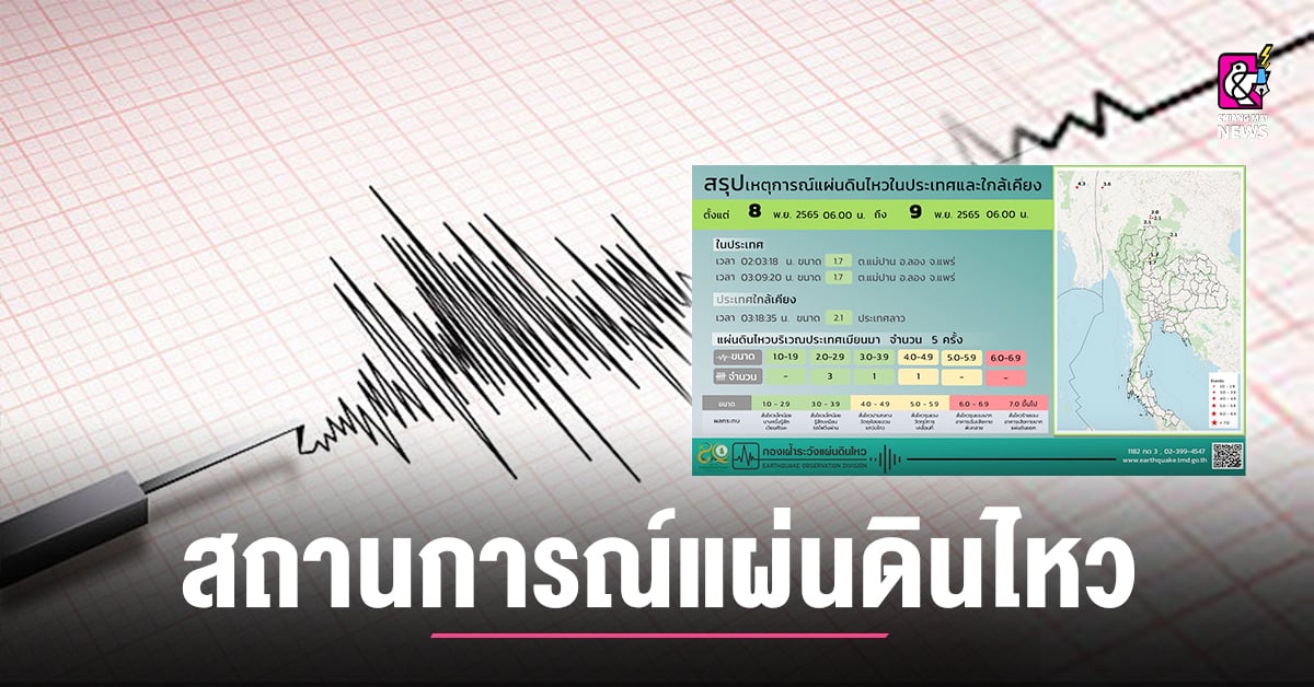 สถานการณ์แผ่นดินไหวในช่วงวันที่ 8-9 พฤศจิกายน 2565 ตรวจพบเหตุการณ์แผ่นดินไหว ขนาด 4.3, 3.6, 2.0, 2.1 และ 2.1 มีศูนย์กลางอยู่ที่ประเทศเมียนมา ขนาด 1.7 และ 1.7 มีศูนย์กลางอยู่ที่ ต.แม่ปาน อ.ลอง จ.แพร่ ขนาด 2.1 มีศูนย์กลางอยู่ที่ประเทศลาว ซึ่งเป็นแผ่นดินไหวขนาดเล็ก ไม่มีผลกระทบต่อประเทศไทยแต่อย่างใด