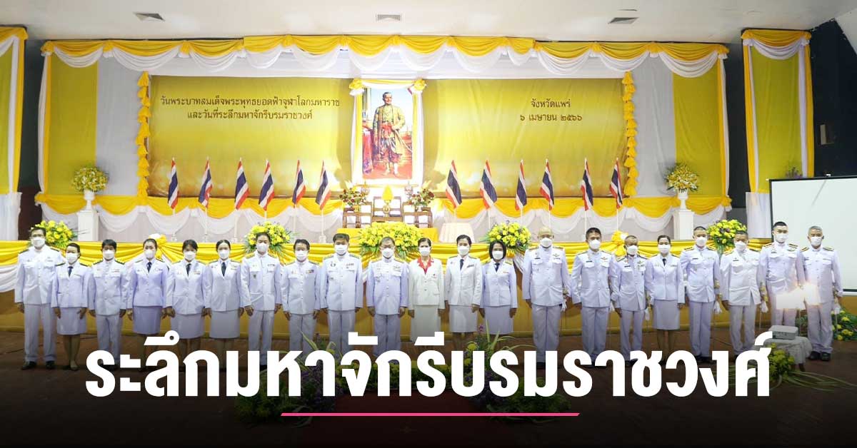 แพร่ ประกอบพิธี “วันพระบาทสมเด็จพระพุทธยอดฟ้าจุฬาโลกมหาราช และวันที่ระลึกมหาจักรีบรมราชวงศ์ในอดีต” เมื่อวันที่ 6 เมษายน 2566 เวลา 07.30 น. นายชุติเดช มีจันทร์ ผู้ว่าราชการจังหวัดแพร่ เป็นประธานในพิธีวันพระบาทสมเด็จพระพุทธยอดฟ้าจุฬาโลกมหาราช และวันที่ระลึกมหาจักรีบรมราชวงศ์ ณ ศูนย์ประชุมและแสดงศิลปวัฒนธรรมล้านนาตะวันออก และกลุ่มประเทศ GMS ตำบลทุ่งโฮ้ง อำเภอเมืองแพร่ จังหวัดแพร่ ในการนี้ นายวีรกานต์ บุญตัน พัฒนาการจังหวัดแพร่ เข้าร่วมพิธีฯ เนื่องด้วยวันที่ 6 เมษายน ของทุกปี ทางราชการกำหนดให้เป็นวันที่ระลึกมหาจักรีบรมราชวงศ์ ทั้งนี้เมื่อวันที่ 6 เมษายน พ.ศ. 2325 เป็นวันที่พระบาทสมเด็จพระพุทธยอดฟ้าจุฬาโลกมหาราช เสด็จปราบดาภิเษก ขึ้นครองราชย์เป็นกษัตริย์แห่งราชวงศ์จักรี และทรงสร้างกรุงเทพมหานคร เป็นเมืองหลวงของไทย มาจนทุกวันนี้