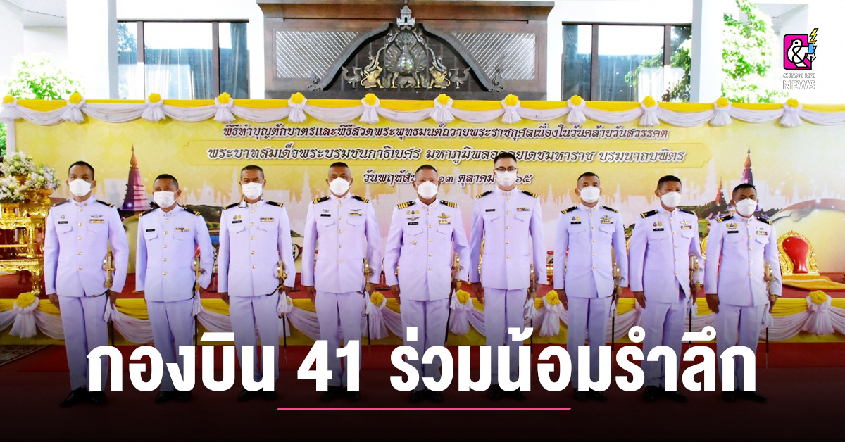 พิธีน้อมรำลึกเนื่องในวันคล้ายวันสวรรคต พระบาทสมเด็จพระบรมชนกาธิเบศร มหาภูมิพลอดุลยเดชมหาราช บรมนาถบพิตร 13 ตุลาคม 2565 เมื่อวันพฤหัสบดีที่ 13 ตุลาคม 2565 นาวาอากาศเอก วงศ์วิวัติ วัฒนวรางกูร ผู้บังคับการกองบิน 41 พร้อมด้วย ข้าราชการกองบิน 41 ร่วมพิธีทำบุญตักบาตรและพิธีสวดพระพุทธมนต์ถวายพระราชกุศลเนื่องในวันคล้ายวันสวรรคต พระบาทสมเด็จพระบรมชนกาธิเบศร มหาภูมิพลอดุลยเดชมหาราช บรมนาถบพิตร 13 ตุลาคม 2565โดยมี นายนิรัตน์ พงษ์สิทธิถาวร ผู้ว่าราชการจังหวัดเชียงใหม่ เป็นประธานในพิธี ณ ศูนย์ประชุมและแสดงสินค้านานาชาติเฉลิมพระเกียรติ 7 รอบ พระชนมพรรษา อำเภอเมือง จังหวัดเชียงใหม่ โดยภายในพิธีได้นิมนต์พระสงฆ์ทรงสมณศักดิ์ จำนวน 10 รูป ประกอบพิธีเจริญพระพุทธมนต์ พร้อมทั้งร่วมทำบุญตักบาตรพระสงฆ์ จำนวน 89 รูป เพื่อถวายเป็นพระราชกุศล และน้อมสำนึกในพระมหากรุณาธิคุณของ พระบาทสมเด็จพระบรมชนกาธิเบศร มหาภูมิพลอดุลยเดชมหาราช บรมนาถบพิตร ที่ทรงมีต่อพสกนิกรชาวไทยอันหาที่สุดมิได้