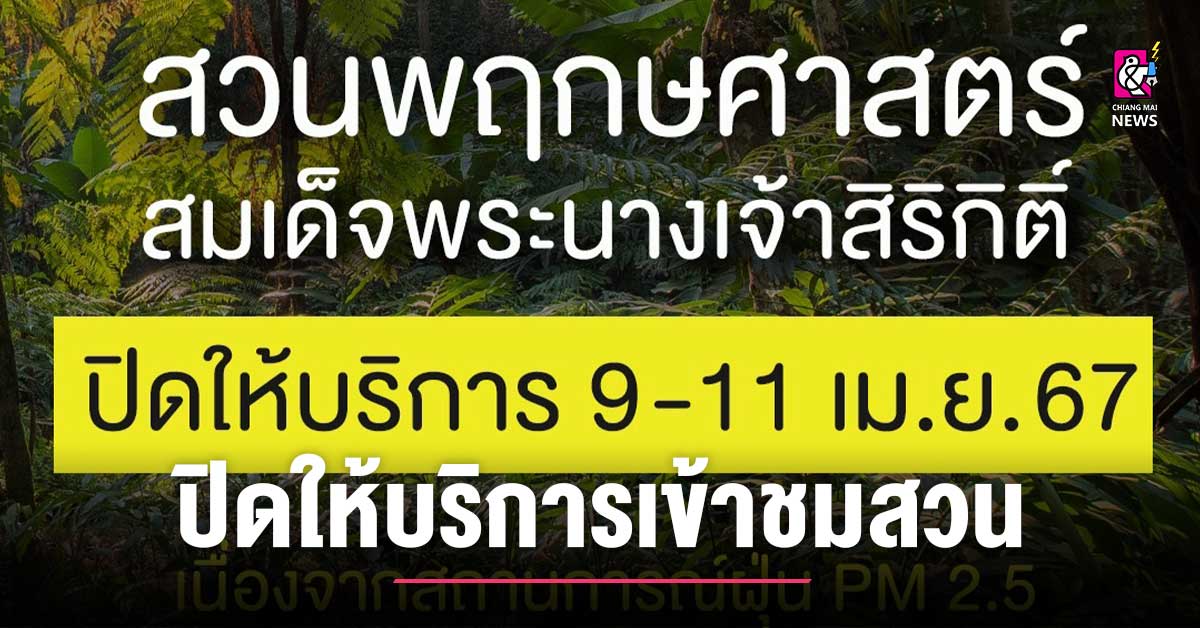 สวนพฤกษศาสตร์ฯ ประกาศปิดให้บริการเข้าชมสวน จากสถานการณ์ฝุ่นละอองขนาดเล็ก (PM 2.5) เกินค่ามาตรฐานอย่างต่อเนื่อง ส่งผลกระทบต่อสุขภาพของประชาชน สวนพฤกษศาสตร์สมเด็จพระนางเจ้าสิริกิติ์ จังหวัดเชียงใหม่ จึงขอประกาศปิดให้บริการเข้าชมสวน ระหว่างวันที่ 9 – 11 เมษายน 2567 เป็นเวลา 3 วัน เพื่อลดความเสี่ยงที่มีผลต่อสุขภาพของนักท่องเที่ยว ที่จะเข้ามาใช้บริการภายในสวนพฤกษศาสตร์ฯ ด้วยความห่วงใยและปรารถนาดีจาก สวนพฤกษศาสตร์สมเด็จพระนางเจ้าสิริกิติ์ อำเภอแม่ริม จังหวัดเชียงใหม่