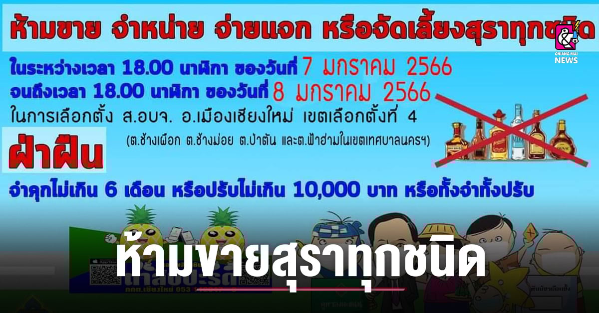 ห้ามขาย จำหน่าย จ่ายแจก หรือจัดเลื้ยงสุราทุกชนิดในระหว่างเวลา 18.00 น.ของวันเสาร์ที่ 7 มกราคม 2566 จนถึงเวลา 18.00 น. ของวันอาทิตย์ที่ 8 มกราคม 2566 ในพื้นที่ ต.ช้างเผือก ต.ป่าตัน ต.ช้างม่อย และต.ฟ้าฮ่าม ในเขตเทศบาลนครเชียงใหม่