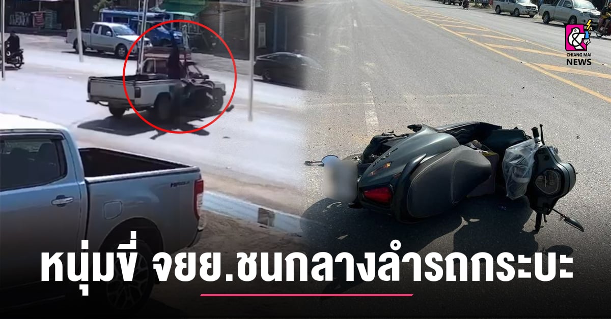 ยิ่งกว่าถ่ายหนัง! หนุ่มขี่ จยย.ชนกลางลำรถกระบะเลี้ยวตัดหน้า ร่างกระเด็นตกท้ายกระบะ