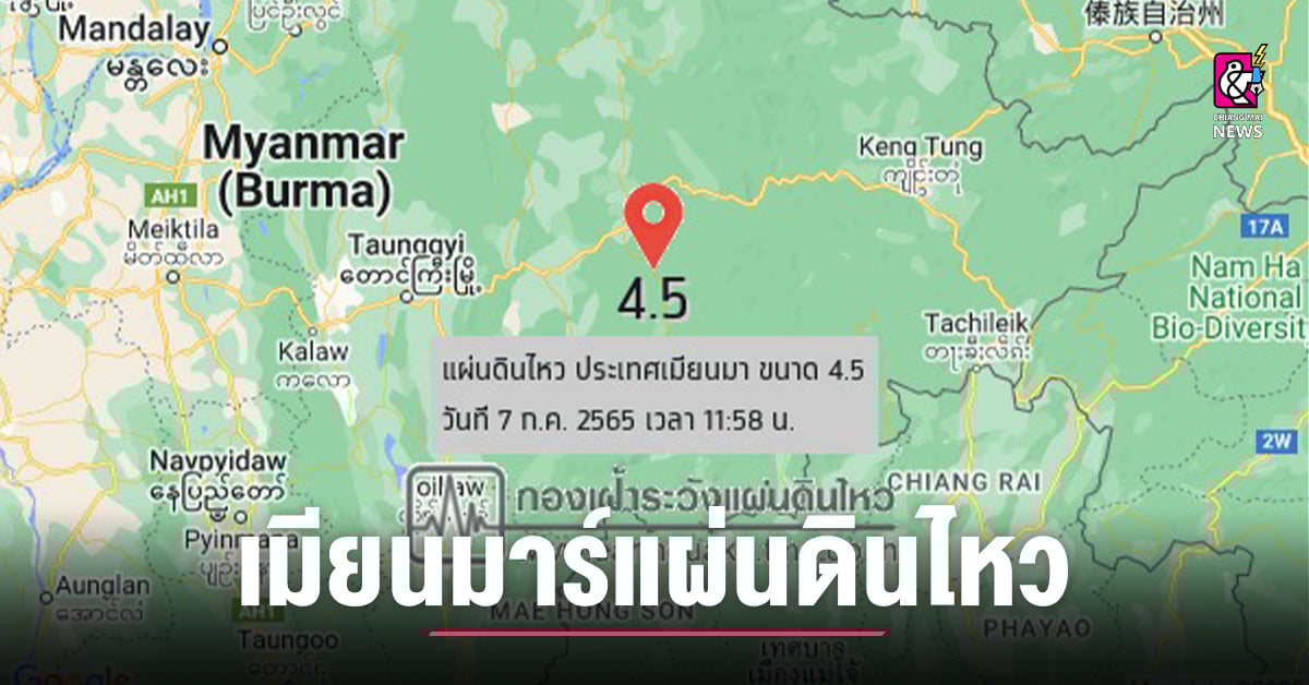 แผ่นดินไหว วันพฤหัสบดีที่ 7 กรกฎาคม พ.ศ. 2565 เวลา 11:58:21 น. บริเวณประเทศเมียนมา (Myanmar) (20.91, 98.27) ขนาด 4.5, ลึก 10 กม. 20.911°N , 98.27°E ทางทิศตะวันตกเฉียงเหนือของ อ.ฝาง จ.เชียงใหม่ ประมาณ 148 กม.