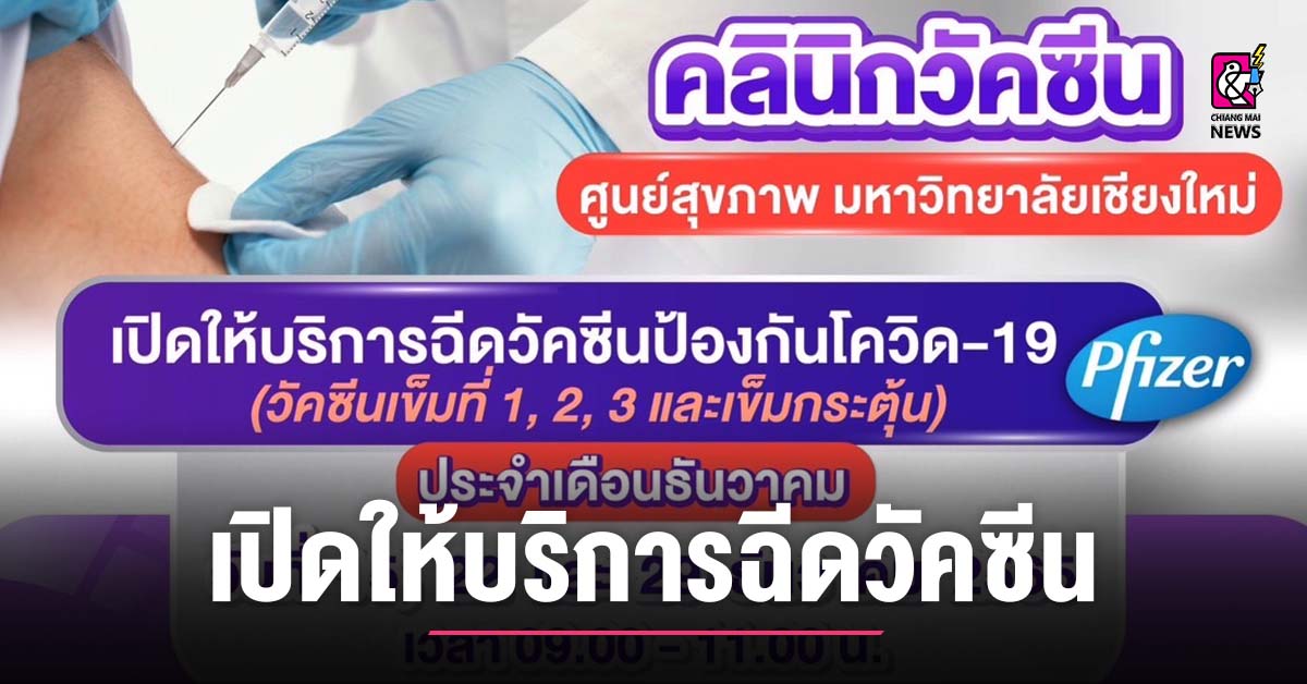 เปิดให้บริการฉีดวัคซีนป้องกันโควิด-19 เข็มที่ 1, 2, 3 และเข็มกระตุ้น คลินิกวัคซีน ศูนย์สุขภาพ มหาวิทยาลัยเชียงใหม่ เปิดให้บริการฉีดวัคซีนป้องกันโควิด-19(วัคซีนเข็มที่ 1, 2, 3 และเข็มกระตุ้น)ประจำเดือนธันวาคมวันที่ 15, 22 และ 29 ธันวาคม 2565เวลา 09.00 – 11.00 น. เกณฑ์ผู้รับบริการ เพื่อความสะดวกรวดเร็วในการมารับบริการ และการบริหารจัดการ การให้บริการวัคซีนได้อย่างมีประสิทธิภาพกรุณาลงทะเบียนจองคิวล่วงหน้าผ่าน QR CODEหรือติดต่อสอบถามและนัดหมาย ที่เบอร์ 053-944981 (ในเวลาราชการ) : ผู้ที่ทำการจองวัคซีนแล้ว สามารถตรวจสอบการจองได้โดยการกรอกเลขบัตรประจำตัวประชาชนลงในระบบ : เริ่มจองได้ตั้งแต่ วันที่ 12 ธันวาคม 65 เป็นต้นไป