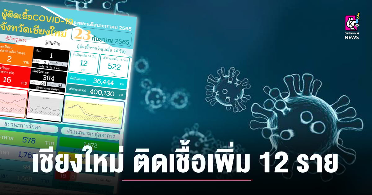 สถานการณ์การแพร่ระบาดเชื้อไวรัสโคโรนา 2019(โควิด-19) จ.เชียงใหม่ วันที่ 27 กันยายน 2565ผู้ติดเชื้อรายใหม่ (เฉลี่ย 14 วัน) 11 ราย (ยืนยันสะสม 36,495 ราย)เข้าข่าย 491 (เข้าข่ายสะสม 401,742 ราย)เสียชีวิตวันนี้ 1 ราย (สะสม 388 ราย แบ่งเป็นผู้เสียชีวิตจากโควิด 303 ราย โรคอื่น 85 ราย) ผู้ป่วยที่รักษาตัว 1,600 ราย (ในรพ. 108 ราย,ผู้ป่วยนอก 1,492 ราย)แบ่งเป็นผู้ป่วยสีเขียว 1,497 รายเหลือง 58 รายเหลืองอ่อน 29 รายและสีแดง 16 ราย (ปอดอักเสบ ให้อ็อกซิเจนอัตราการไหลสูง 6 ราย,ใส่ท่อช่วยหายใจ 10 ราย)รักษาหายแล้ว 355 ราย จำนวนผู้ฉีดวัคซีน […]