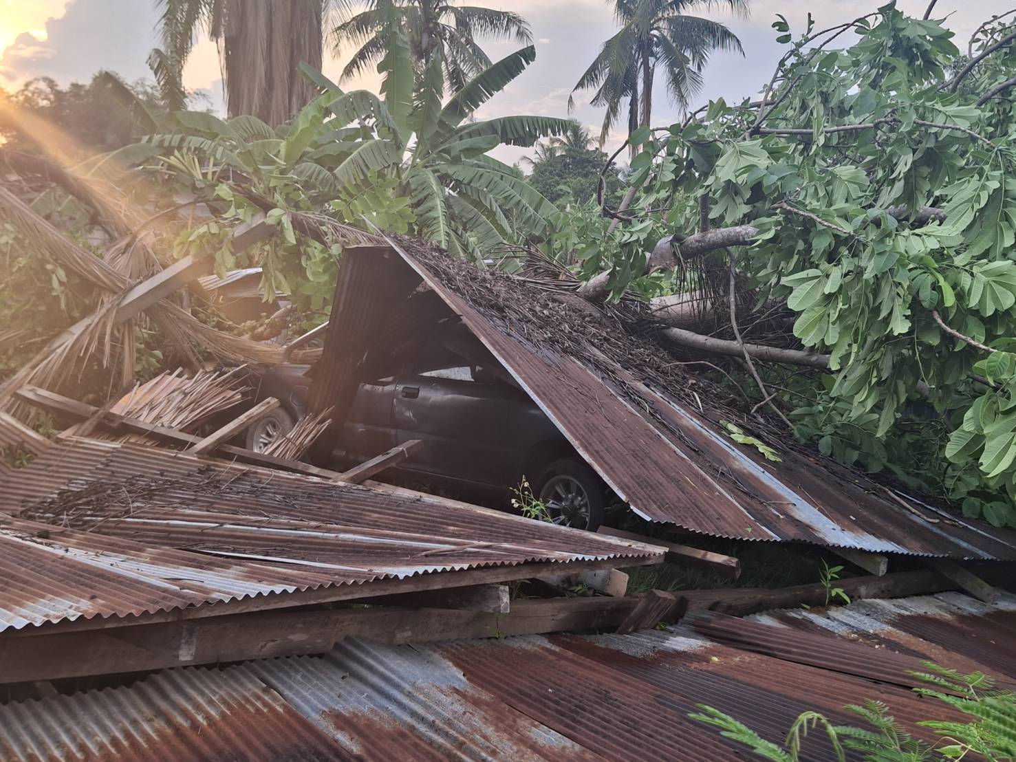พายุฤดูร้อนพัดถล่ม อ.แม่สอด จ.ตาก ต้นไม้หักลัมทับเสาไฟฟ้าแรงสูงทับถนนและโรงจอดรถ รถยนต์เสียหายทั้งคัน