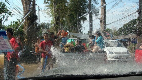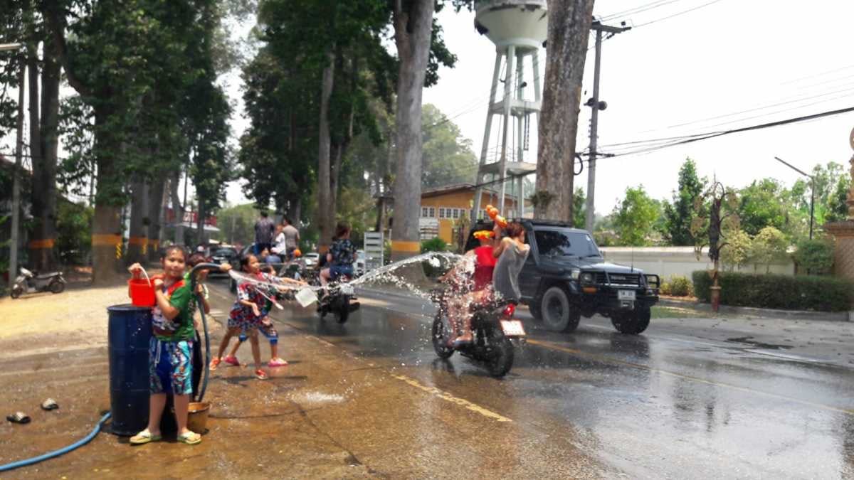 เที่ยวที่ออกมาเล่นน้ำกันเป็นจำนวนมากทั้งสองฟากฝั่งถนน เนื่องมีต้นยางยักษ์ปกคลุมทำให้